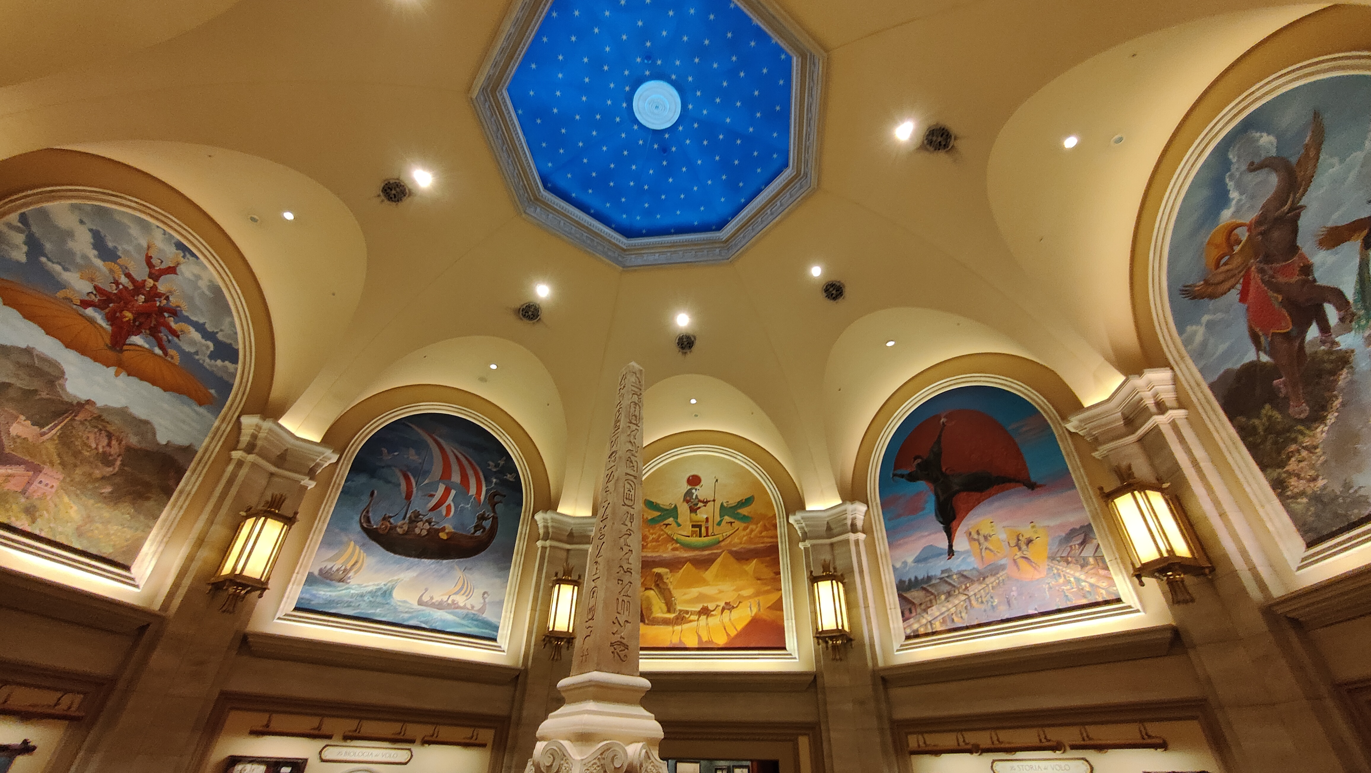 Après avoir passé les files d’attente, la sécurité et les portiques, on arrive devant une grande place avec un globe terrestre qui semble flotter sur une fontaine. On pourrait croire qu’il s’agit d’une place centrale qui donne accès aux « lands », vu sa forme, mais non, pour accéder au reste du parc on doit passer sous l’hôtel MiraCosta.