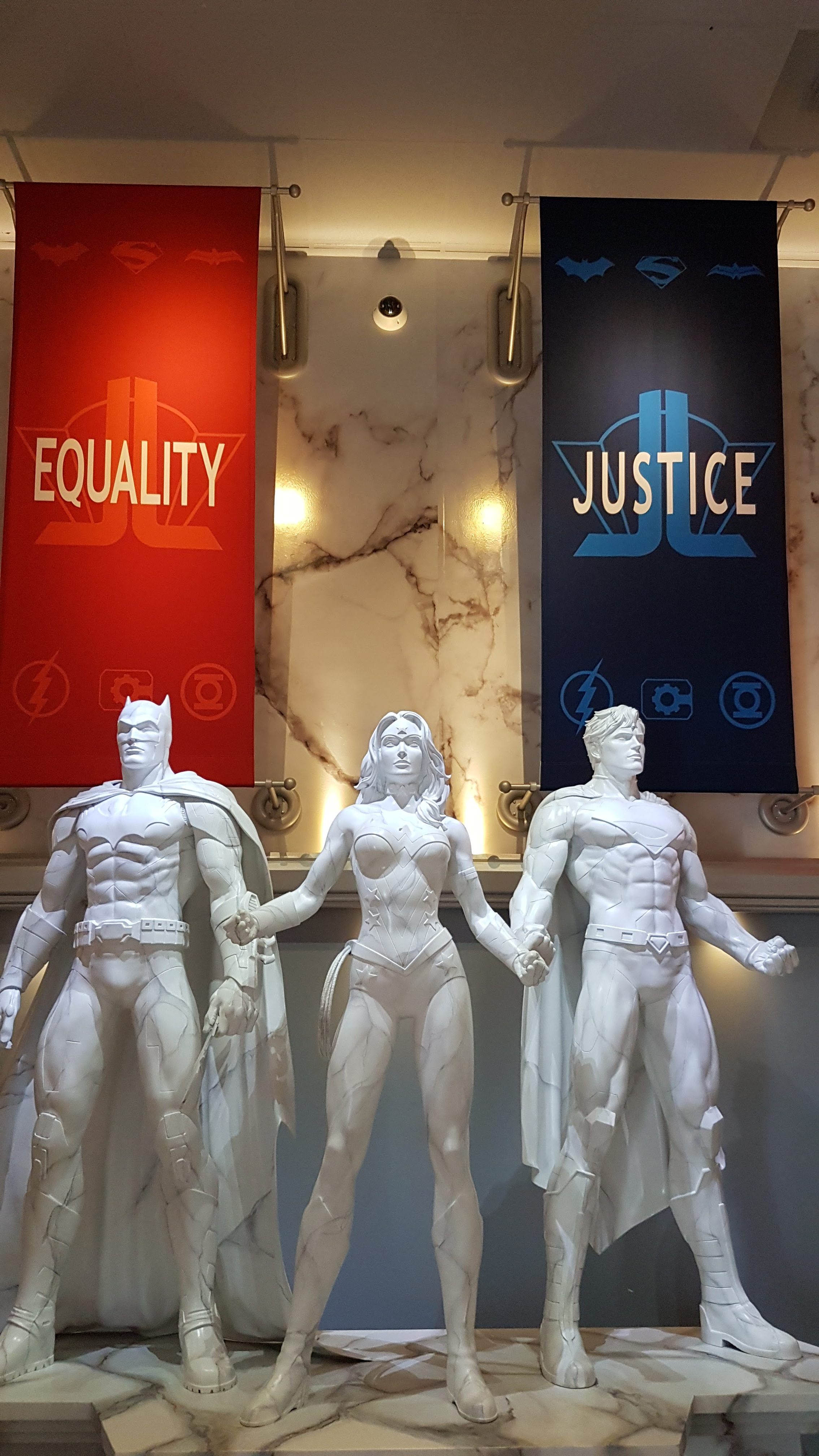 On entre dans le Hall of Justice, dont la déco est très bien faite avec statues et animatronics de super héros DC.