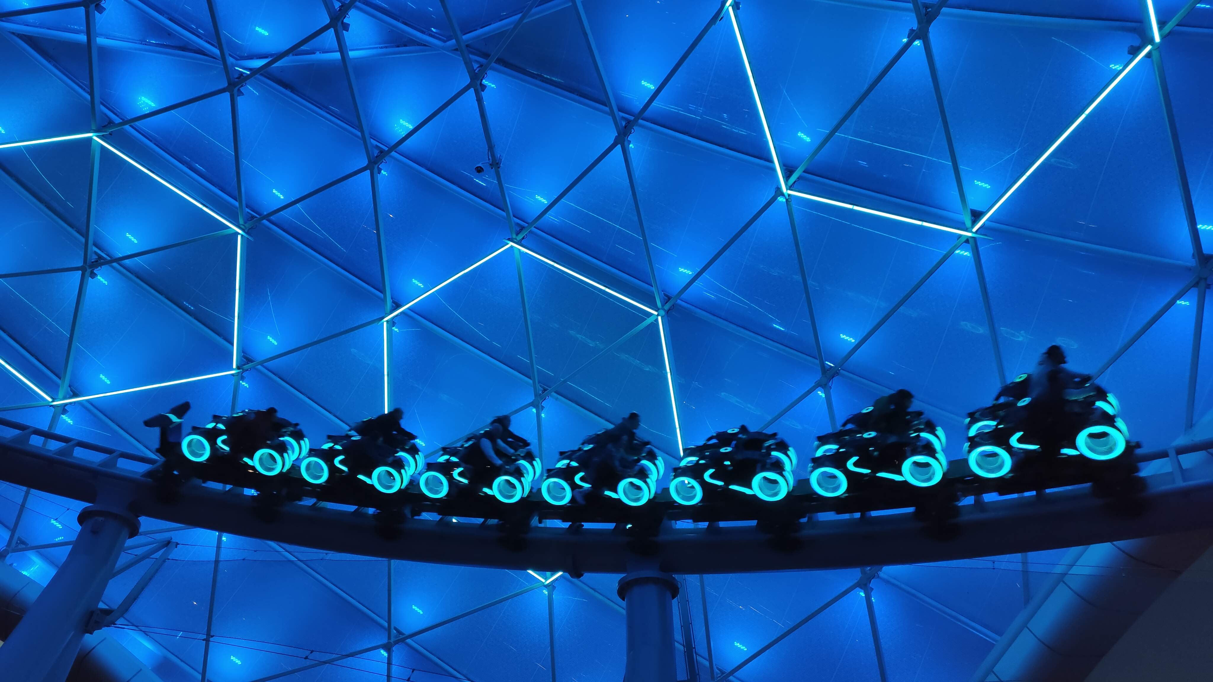 Une fois en intérieur, la file est très jolie. Elle exploite le thème de TRON, tout en néons fluos. Le mur-écran d’une salle devient transparent pour révéler la piste en contrebas, c’est très bien fait et ça met dans l’ambiance. A noter, qu’il y a des lockers gratuits dans la file puisqu’on ne peut rien emmener avec soi en raison de la position.