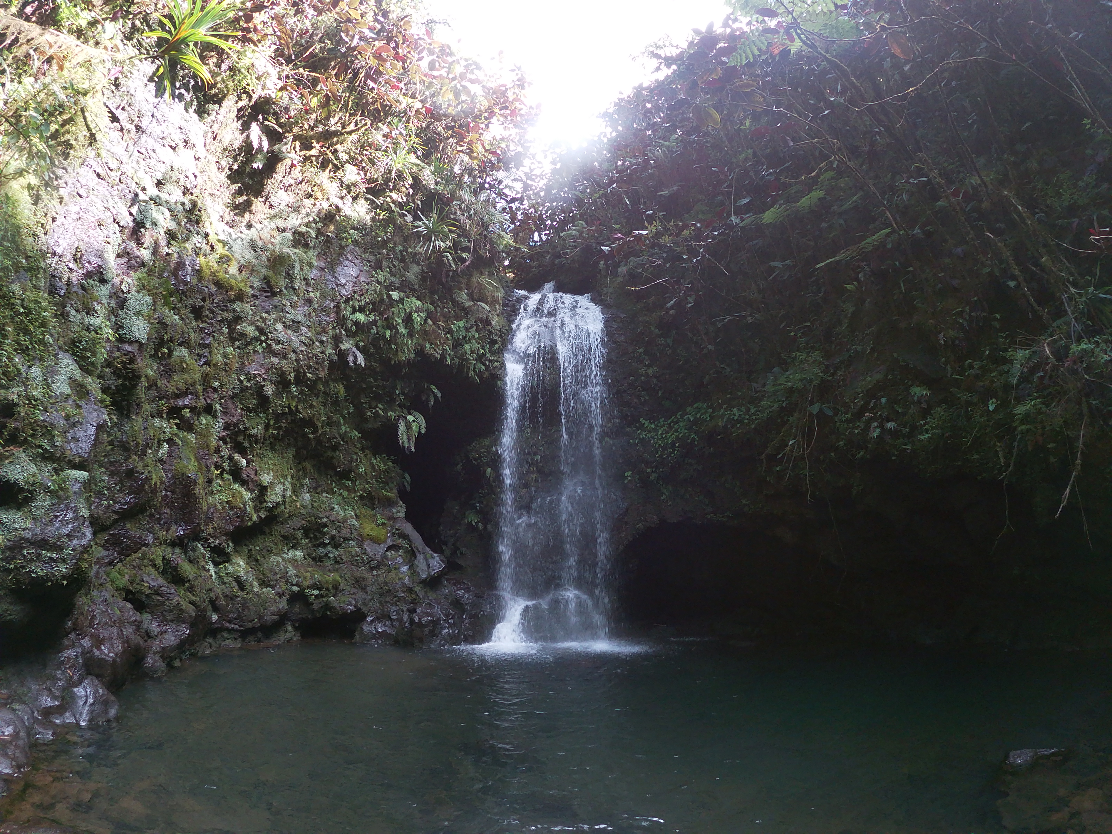 L’accès au lavatube se fait via un chemin qui suit un cours d’eau. La végétation est luxuriante et l’on peut contempler nos premières cascades. Celles-ci, nous n’allons pas les escalader.