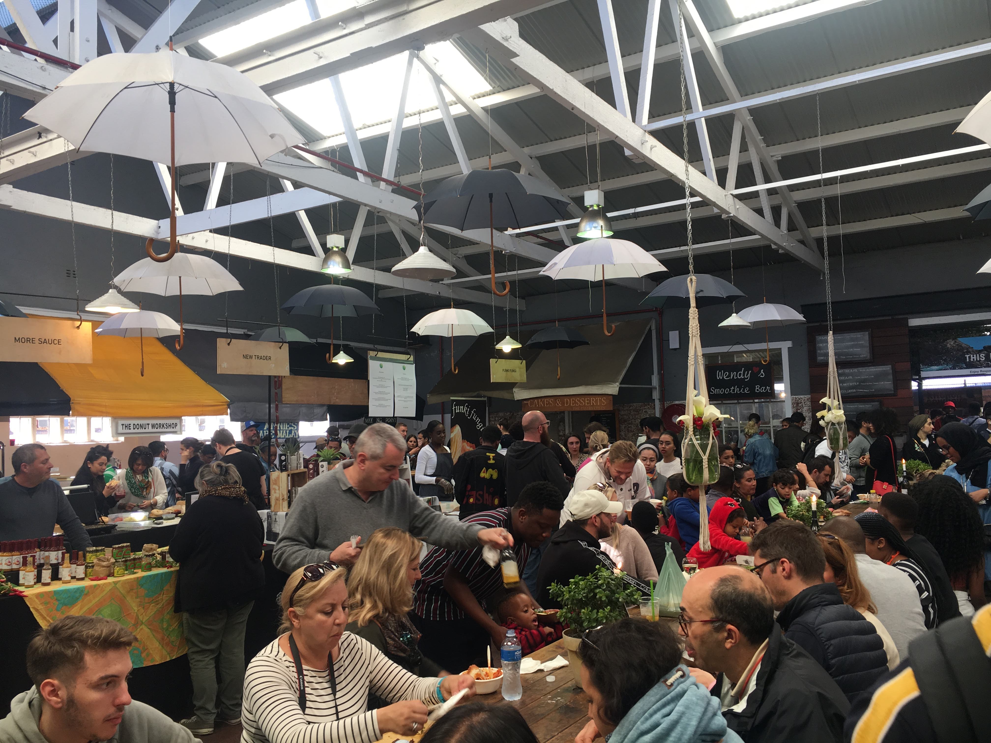 De l’autre, c’est le Neighbourgoods Market. Pour les Londoniens, on aurait l’impression de se retrouver au marché de Bricklane, voir Camden (mais qui est plus grand et plus « commercial »). Des toiles tendues permettent de s’installer à l’abris et un groupe joue de la musique.