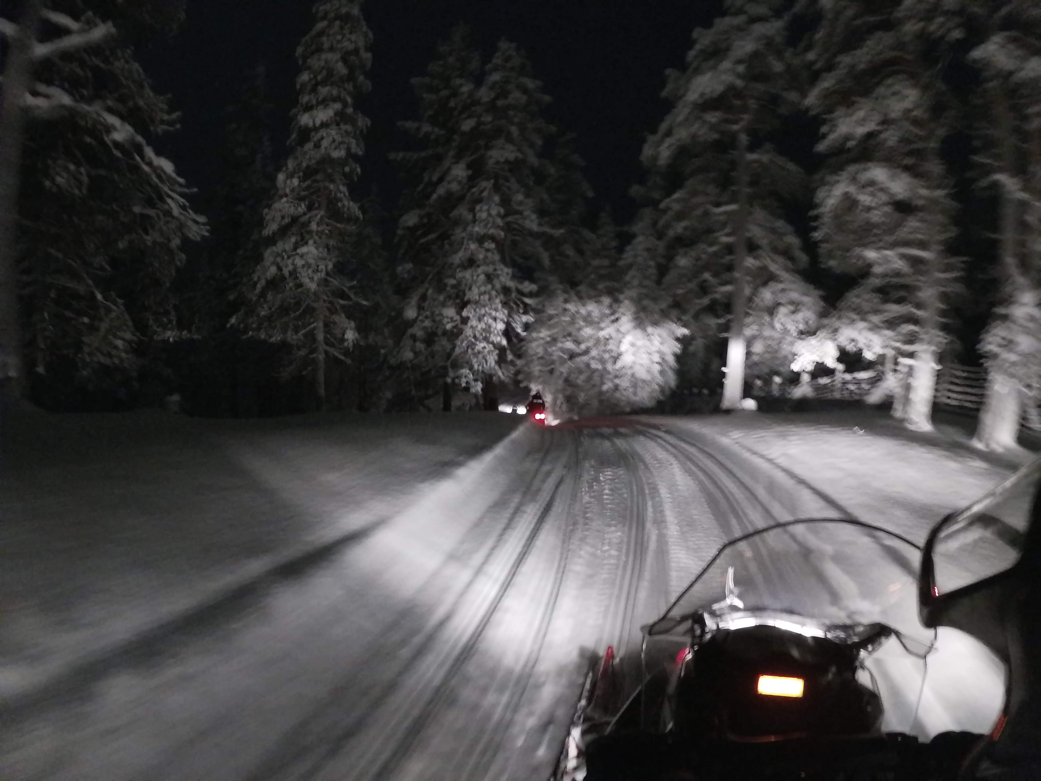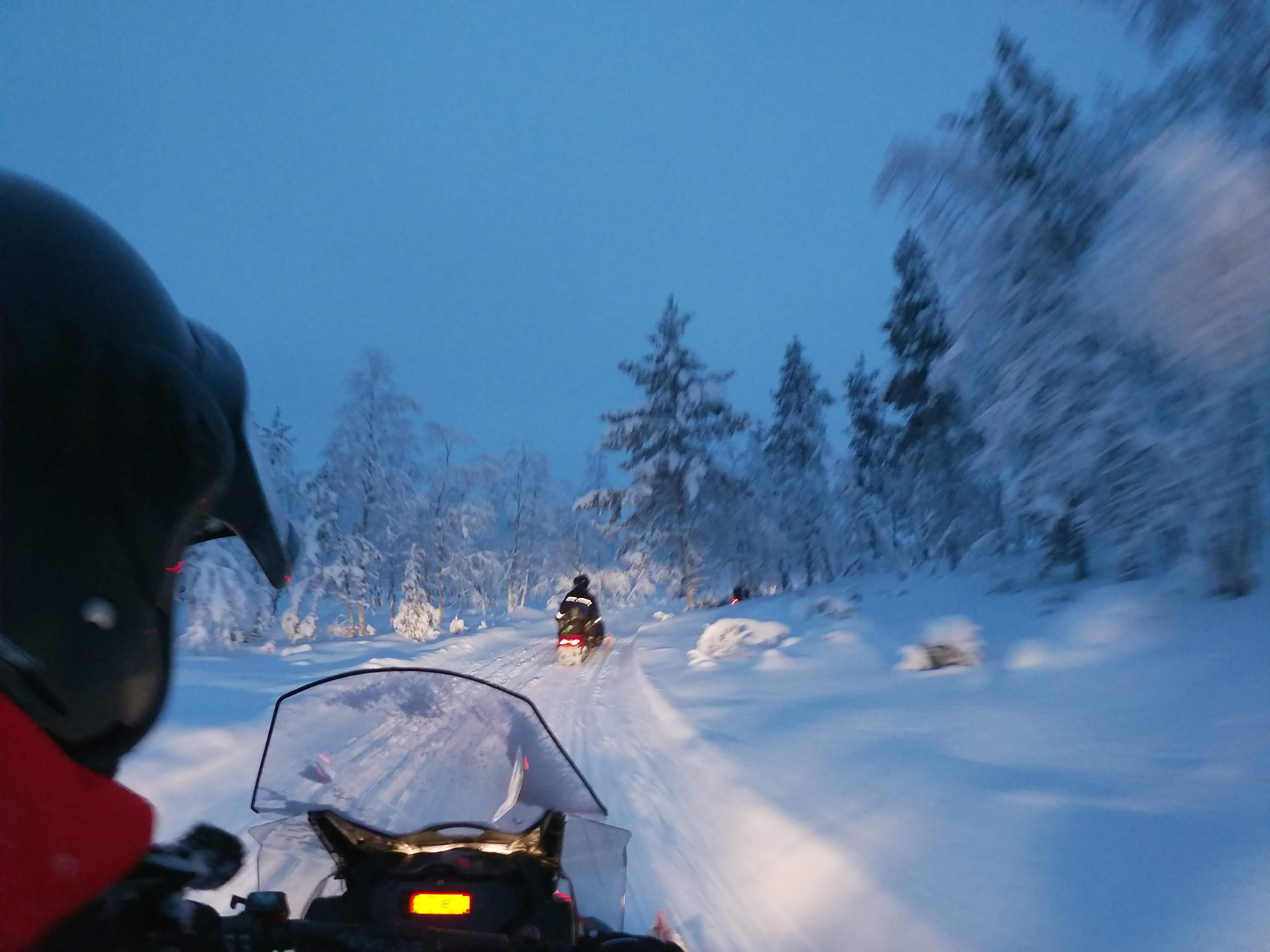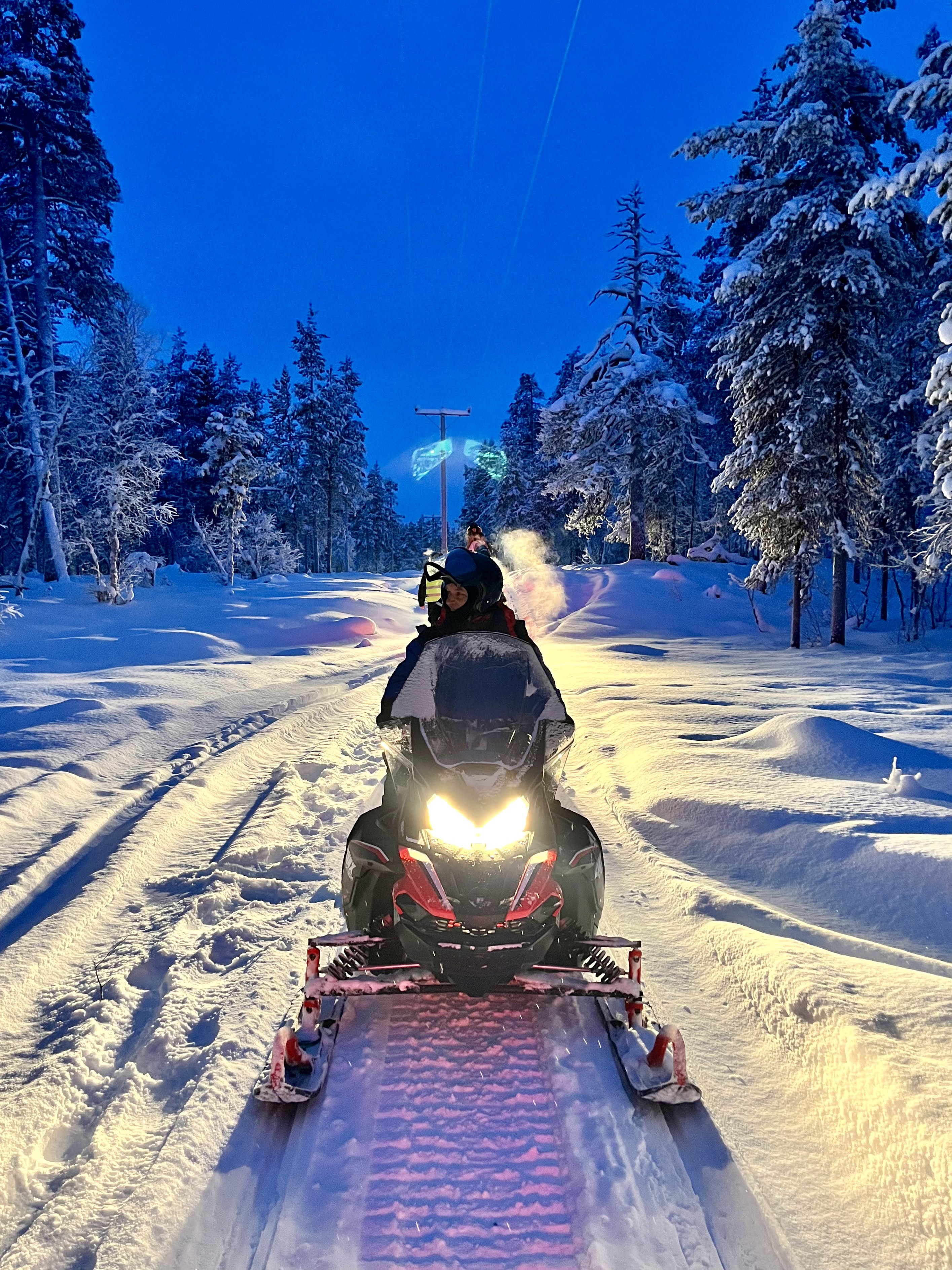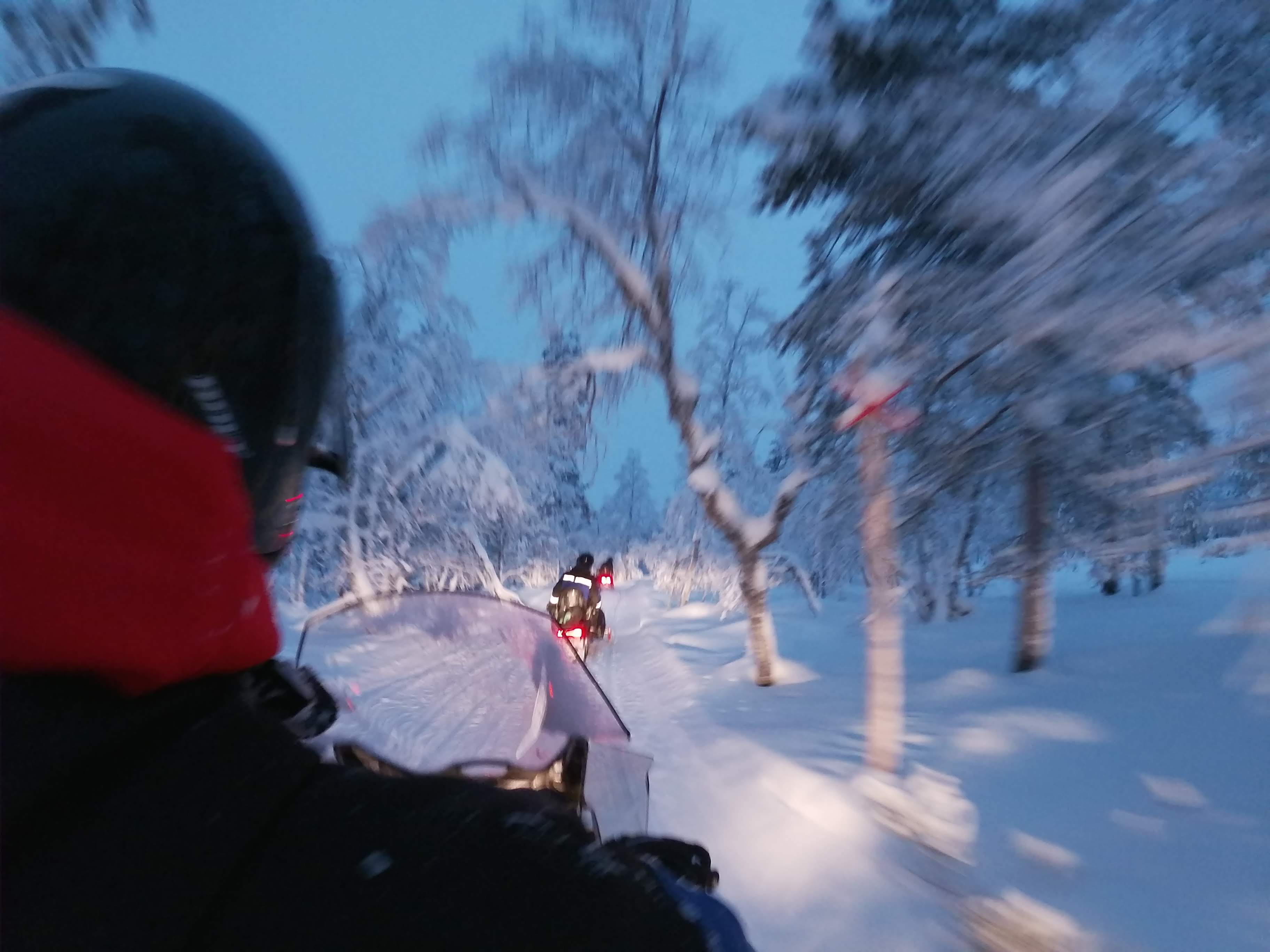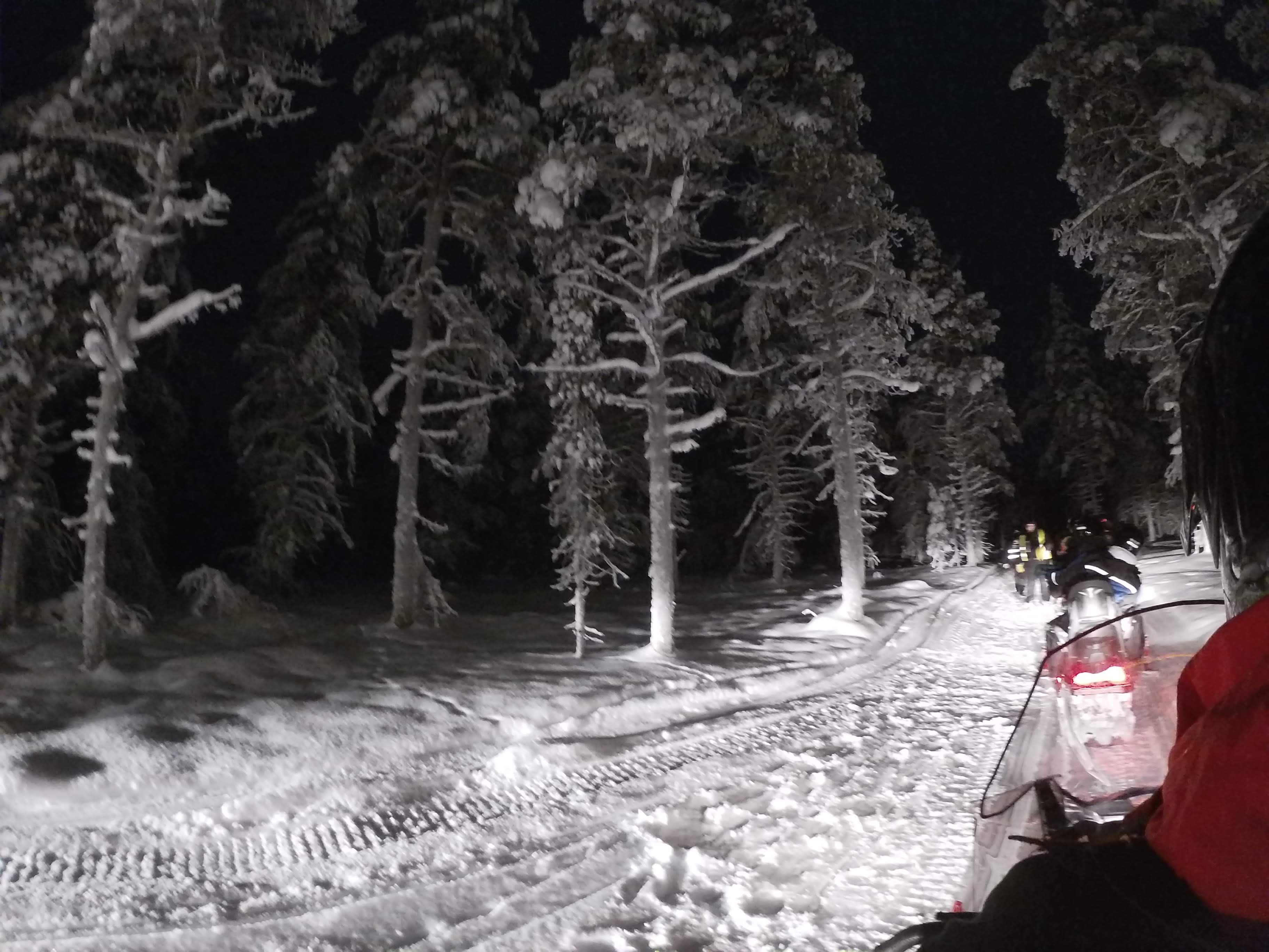 Pour finir notre séjour, nous nous inscrivons à une chasse aux aurores boréales en motoneige. Bon, nous savons que nous ne verrons rien puisque le ciel est toujours couvert et que l’activité géomagnétique est au plus bas. Mais bon, ce sera de nuit et les enfants adorent la motoneige.