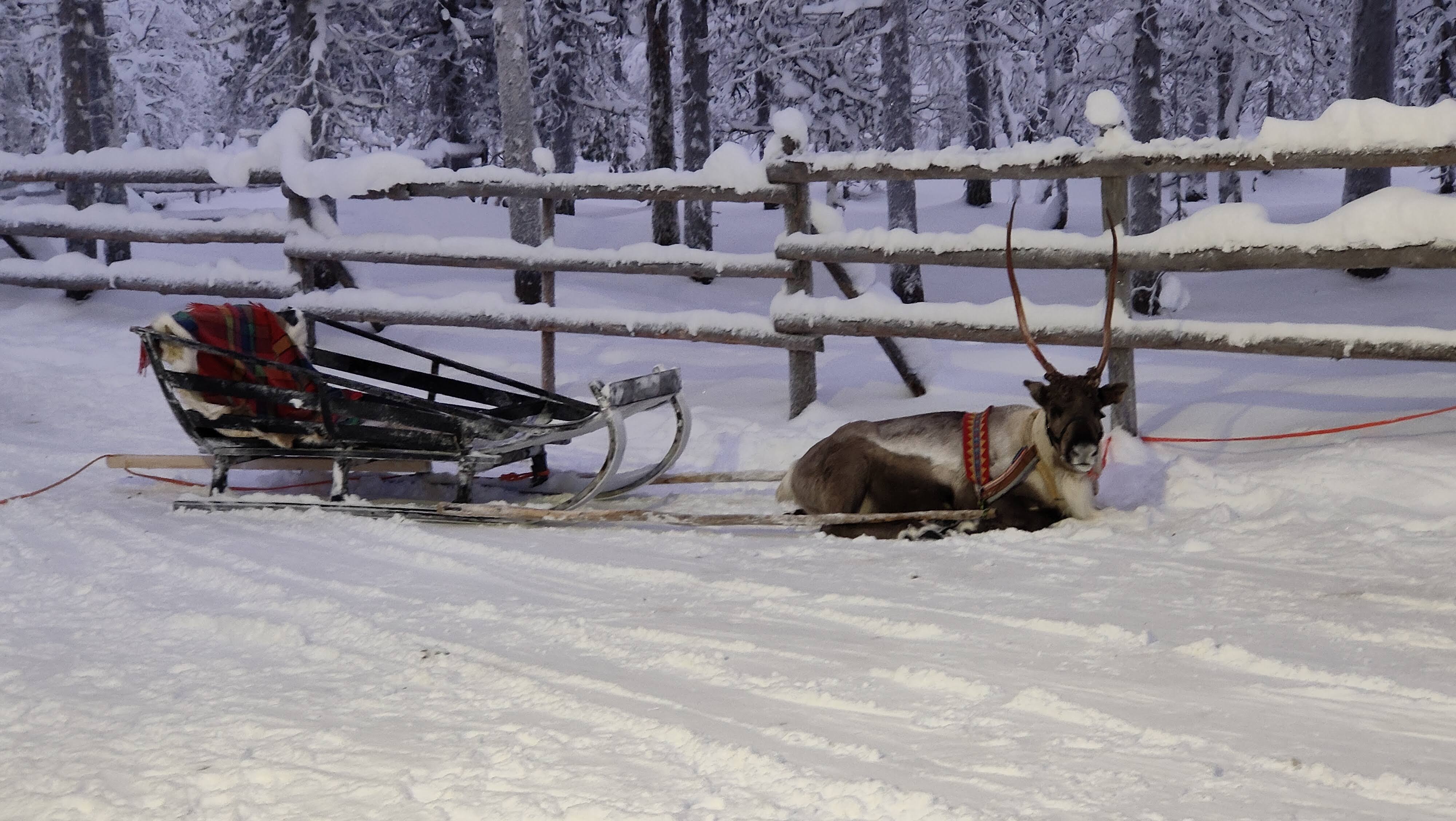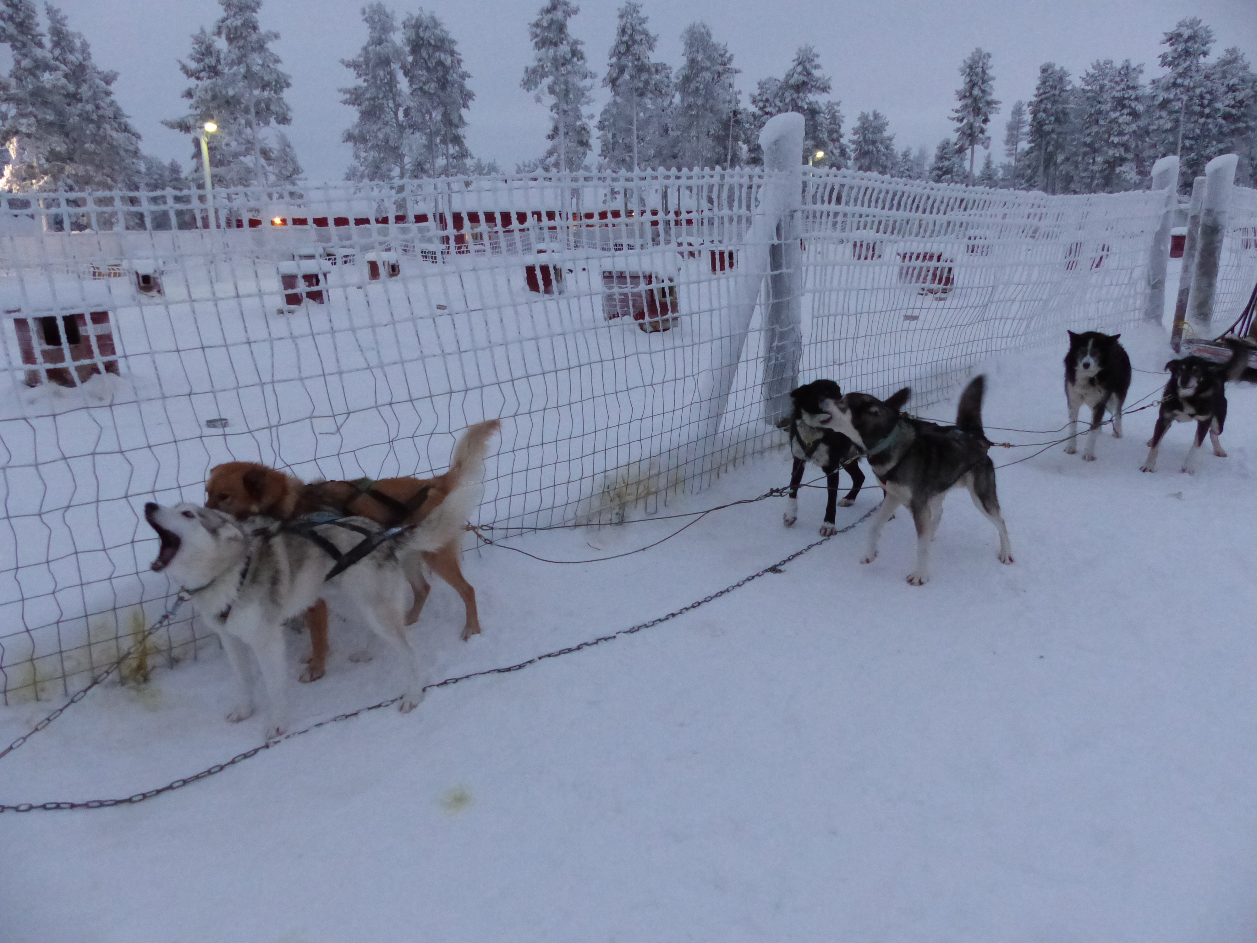 Une petite balade en traineau fait parti de l’activité. Elle se déroule sur un ‘circuit‘ où les rennes sont attachés les uns aux autres en file indienne. Ca fait vraiment manège à touristes, mais bon…