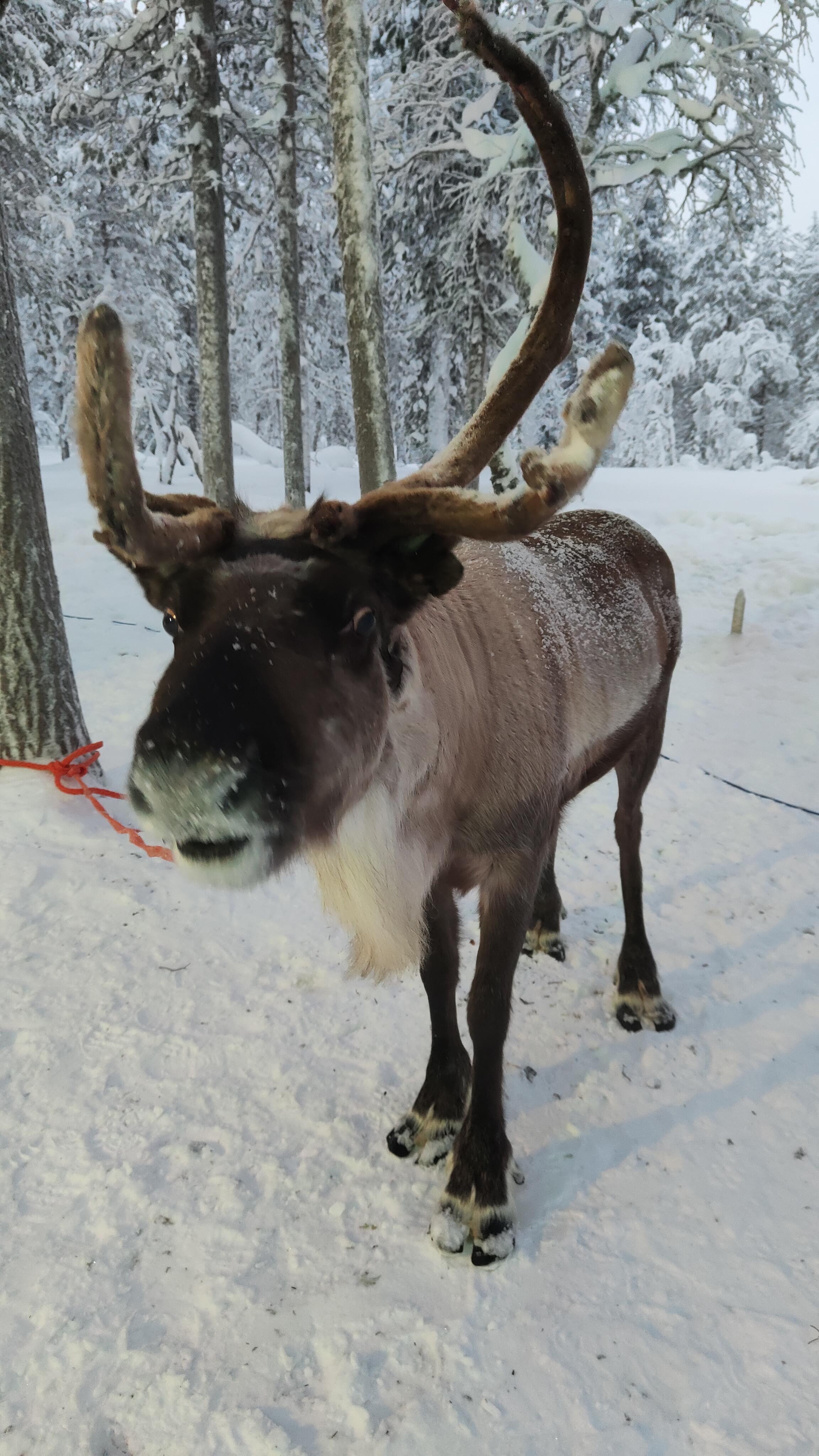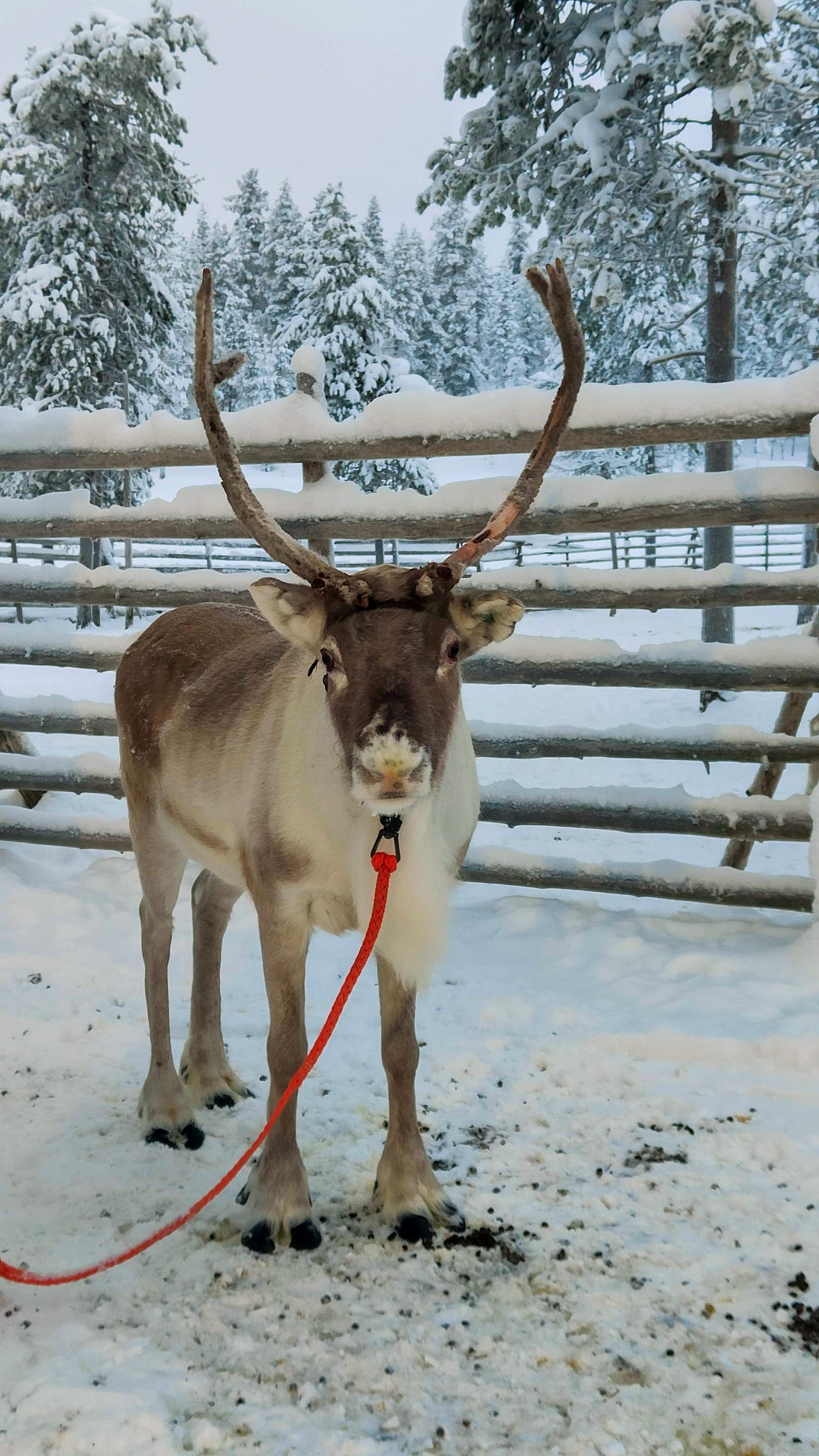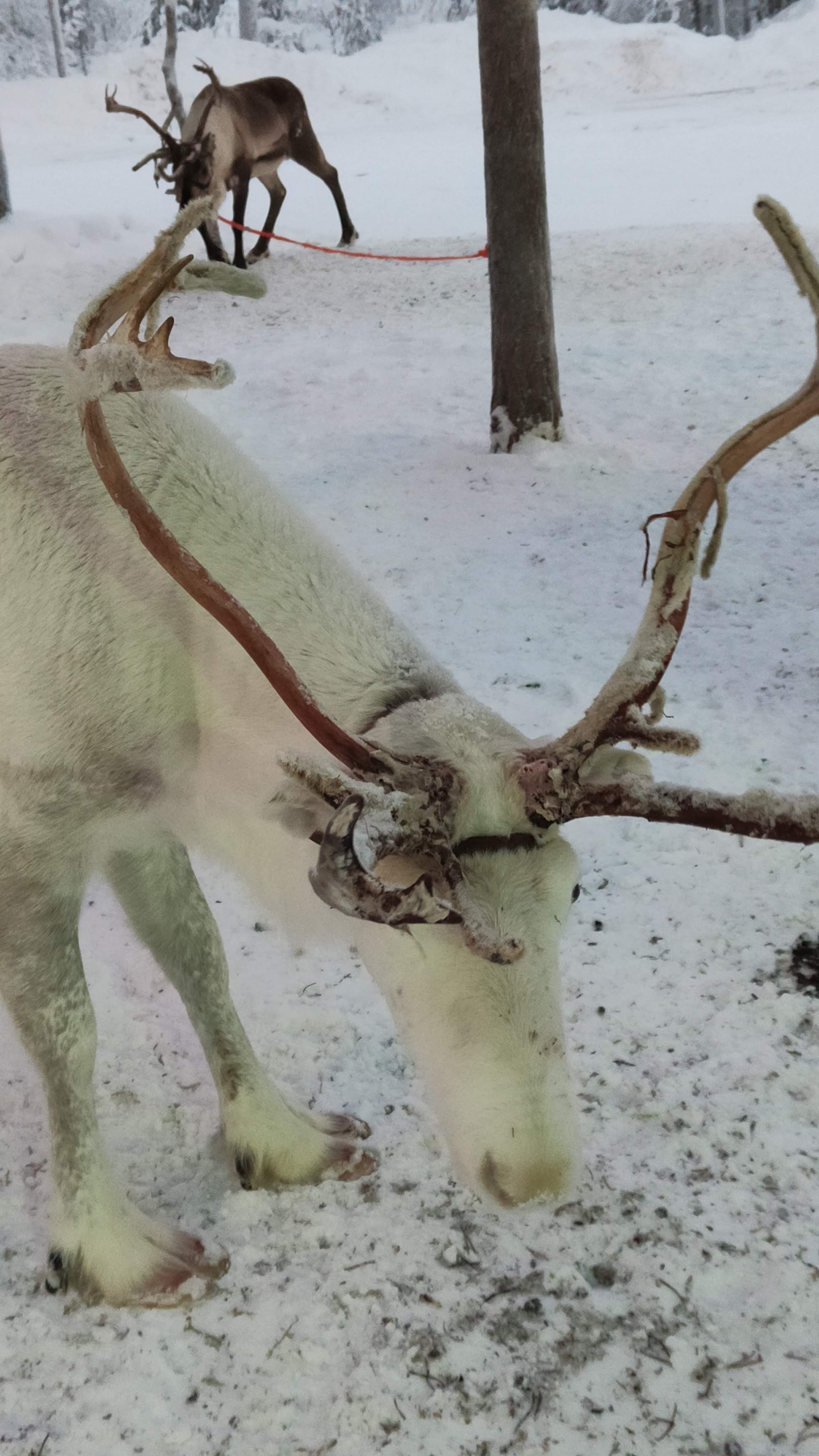 Nous arrivons à la ferme de rennes. Là, nous sommes accueillis par des personnes en costumes traditionnels qui nous expliquent quelques notions à propos des rennes. Puis, nous pouvons en nourrir quelques uns qui sont attachés. Ensuite, nous nous essayons au lasso sur des bois de rennes posés sur le sol.