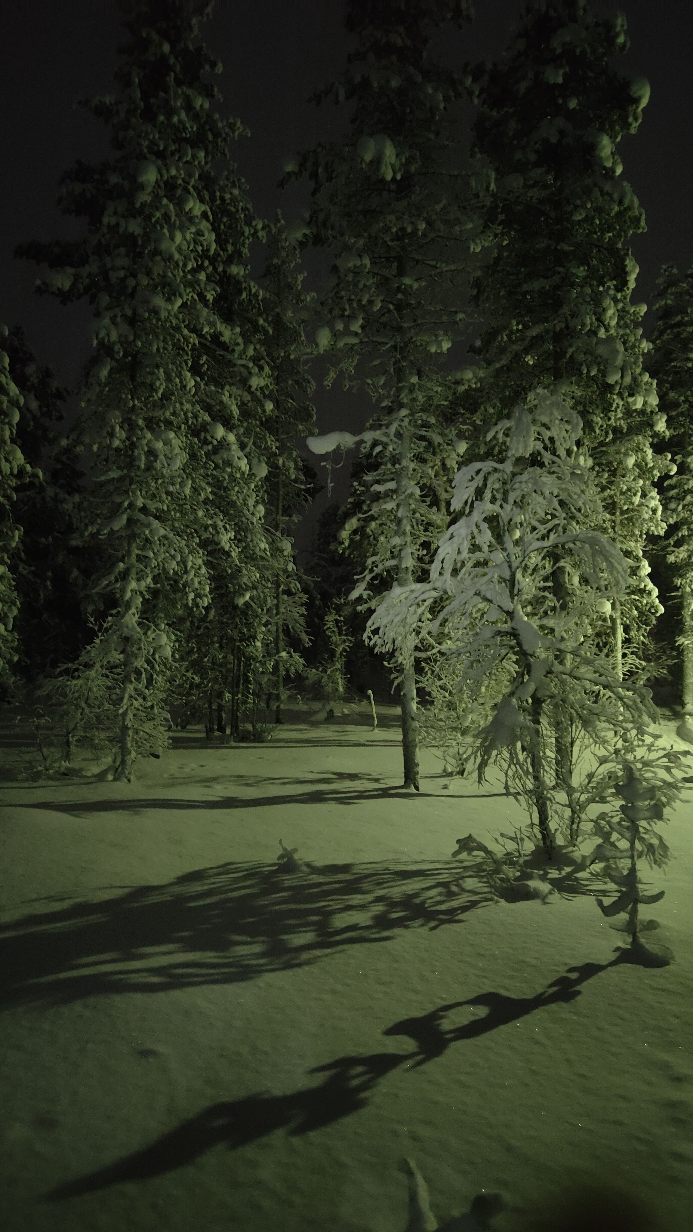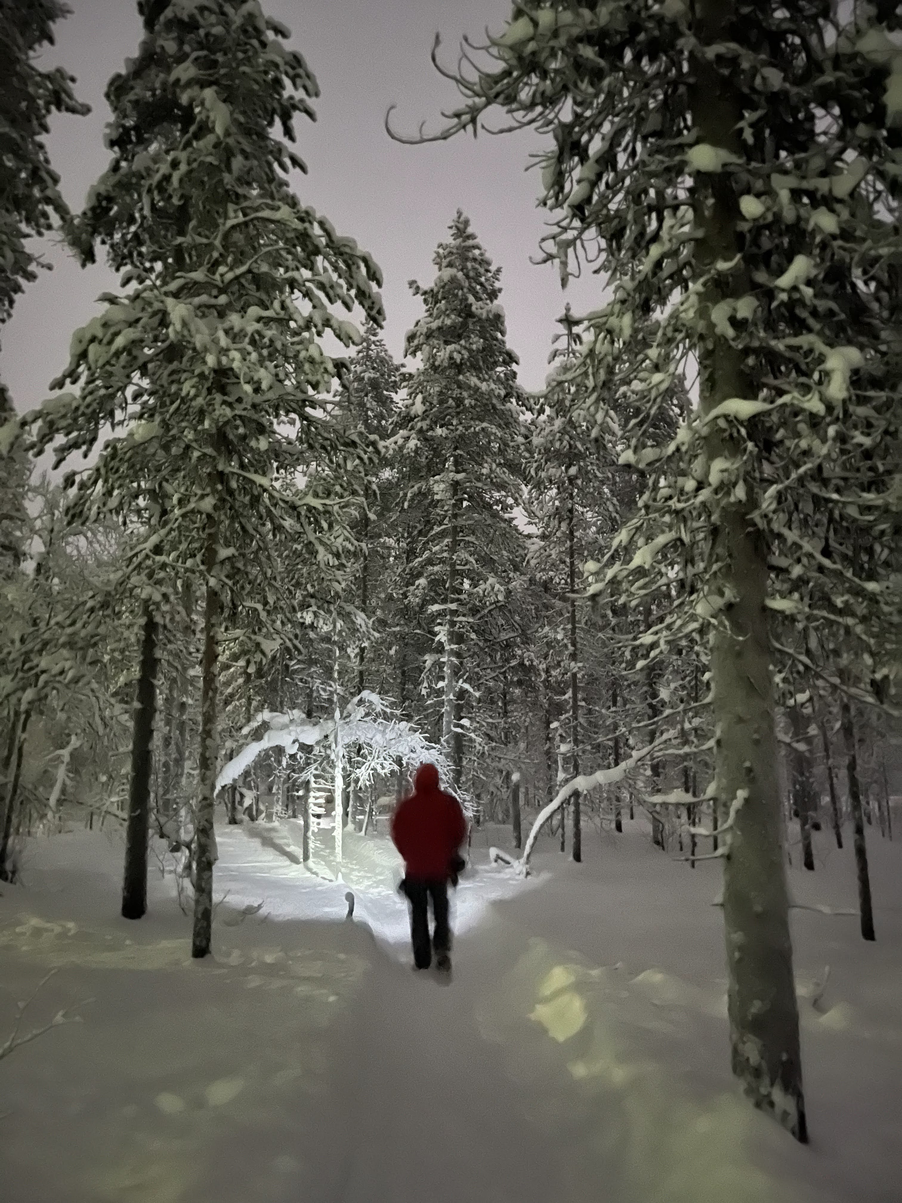 Pour notre balade nocturne, j’ai pris la lampe frontale que j’avais emmenée. Les appareils photos ont tendance à corriger la luminosité mais il fait vraiment noir entre les oasis de lumière créés par les éclairages de la piste de ski de fond.