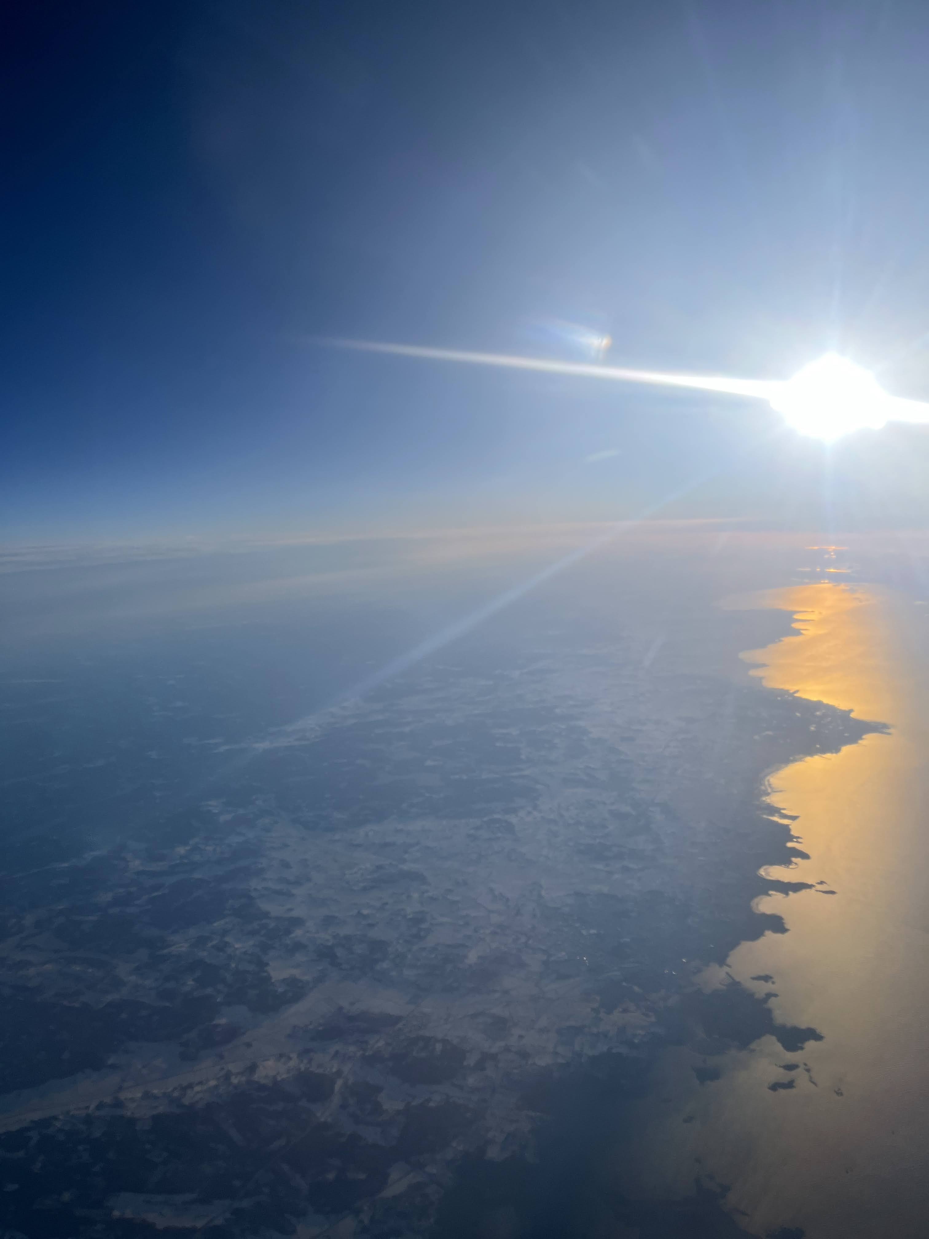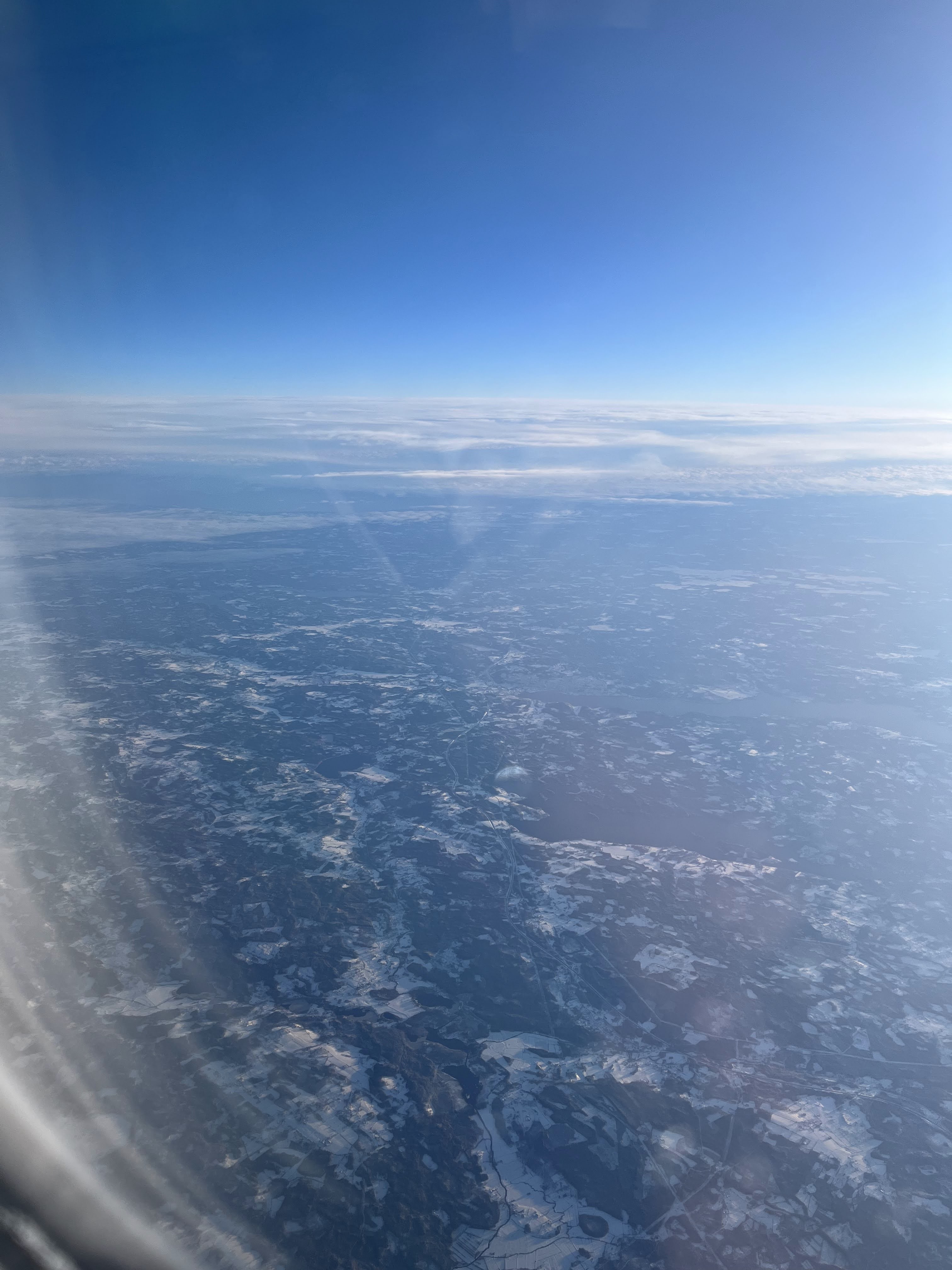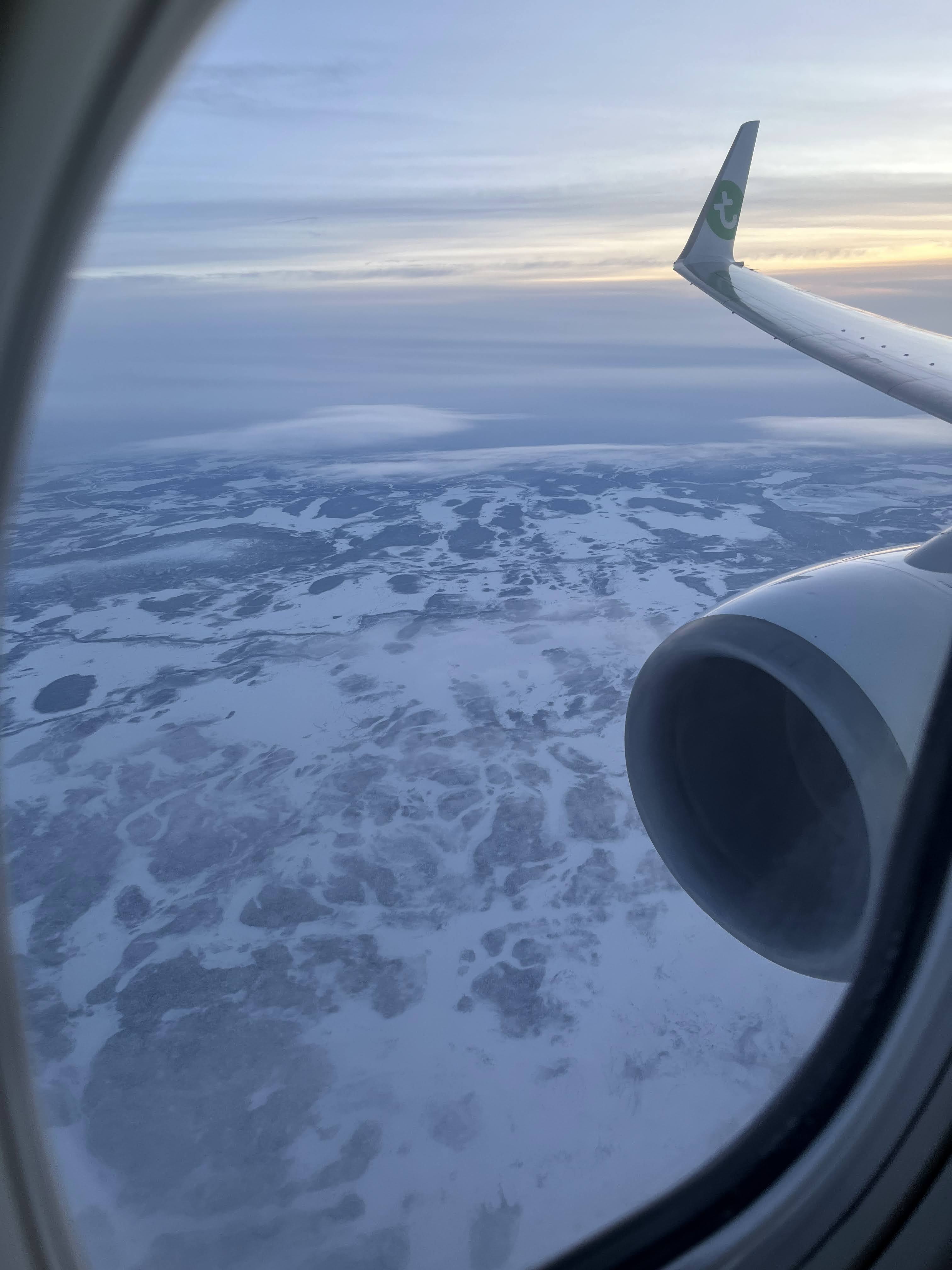 En vol, notre pilote nous indique que nous pouvons voir des fjords par le hublot. En effet, nous sommes bien en Scandinavie ! C’est confirmé peu avant l’atterissage par les paysages enneigés.