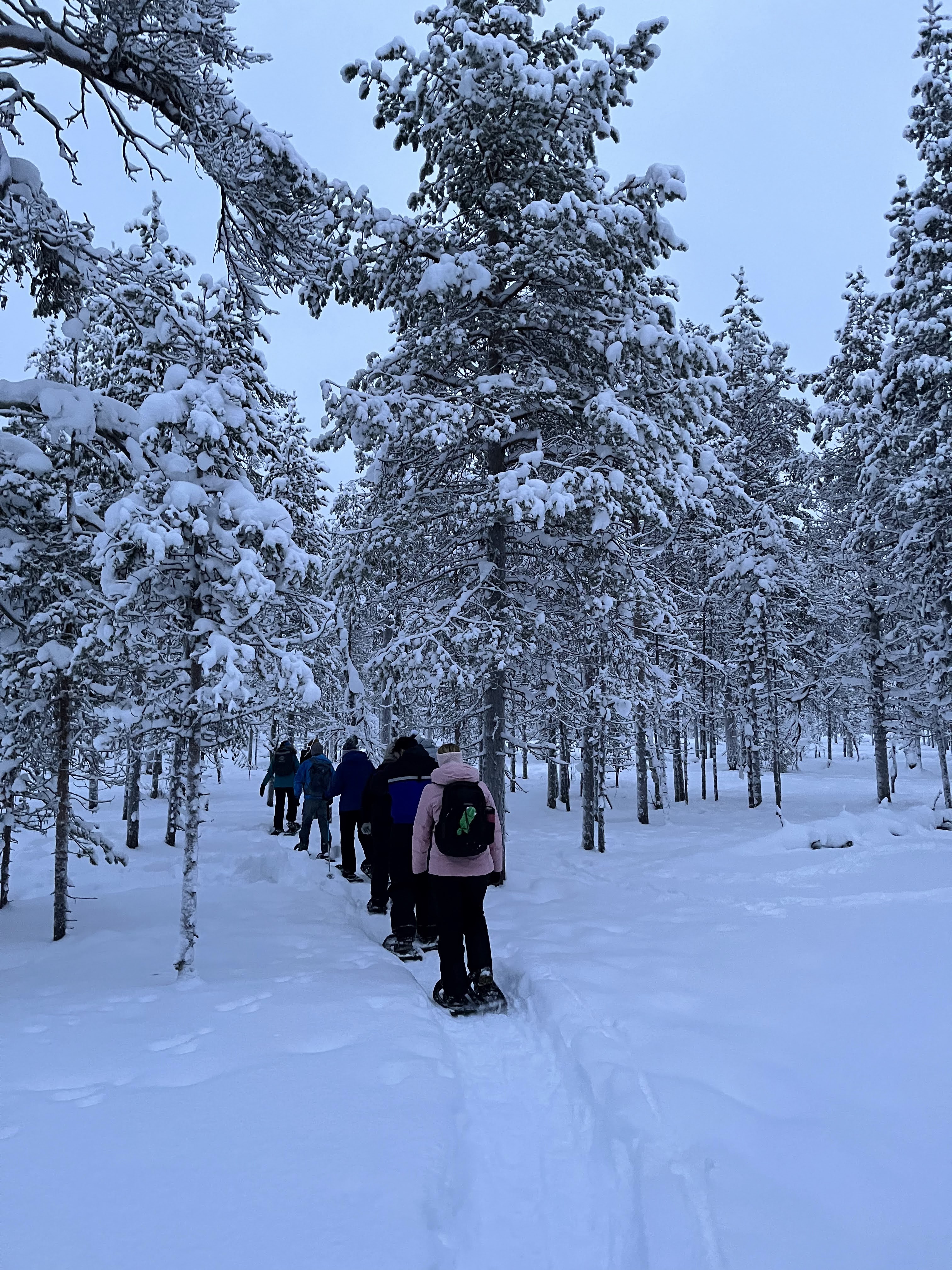 Pour notre dernier jour, nous ferons une randonnée en raquettes. Nous hésitons à prendre notre combinaison grand froid car il ne fait toujours que -5°C et nous allons être actifs. Finalement, nous la prenons, seule Julie la met dans son sac à dos. Et il s’avèrera qu’elles seront bien inutiles, nous les enlèverons même pour les porter autour de la taille.