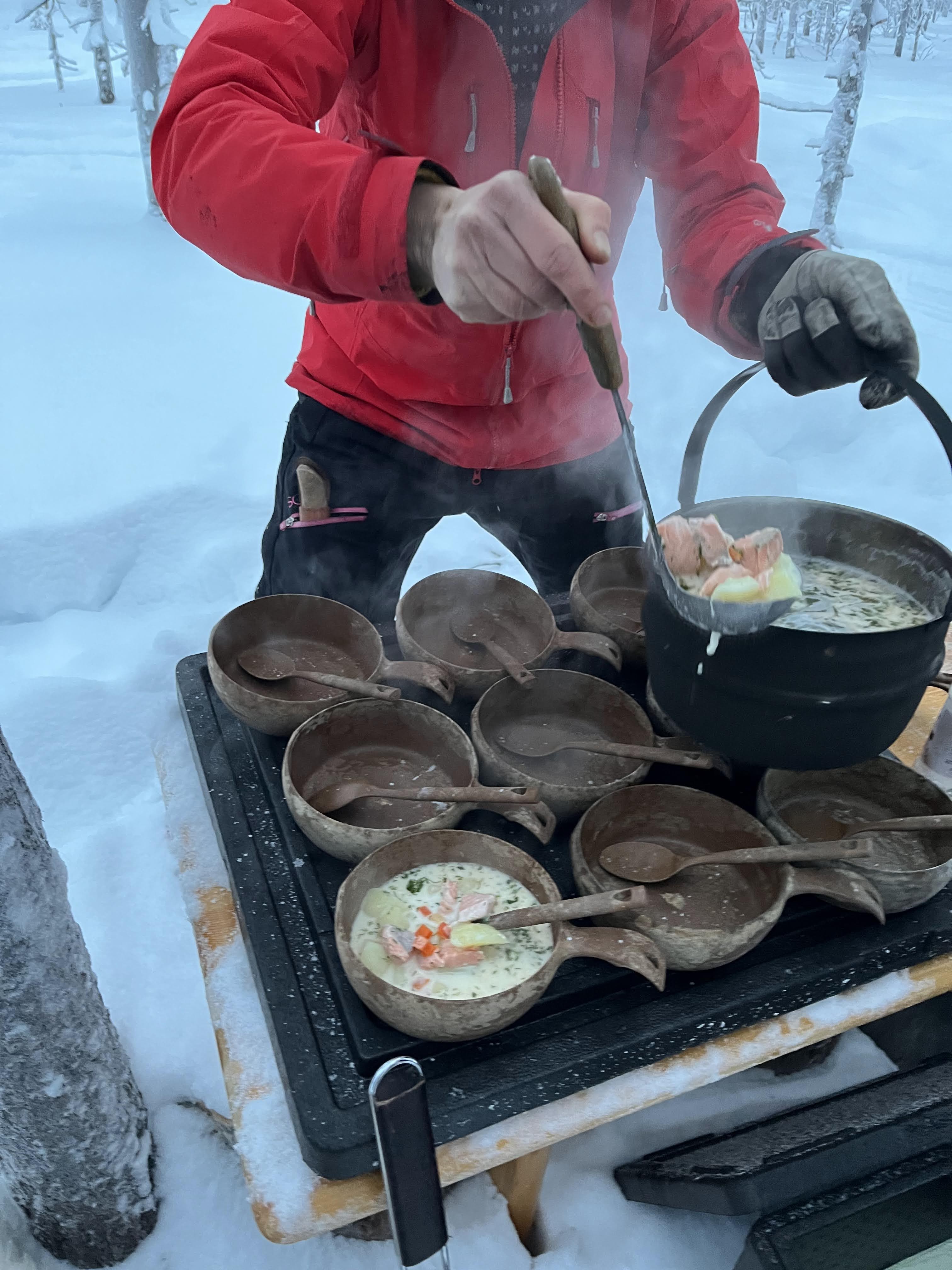 Les activités étaient toutes très agréables et très bien encadrées. La ferme à rennes était quand même un peu trop touristique à notre gout comme, dans une moindre mesure, la randonnée avec les huskys. Mais je suppose qu’il n’y a pas vraiment d’autre moyen de découvrir ces pratiques en seulement quelques jours. Finalement, c’est la randonnée raquettes qui nous a beaucoup plu alors qu’elle s’annonçait moins ludique que les autres. De plus, la soupe de saumon était délicieuse !