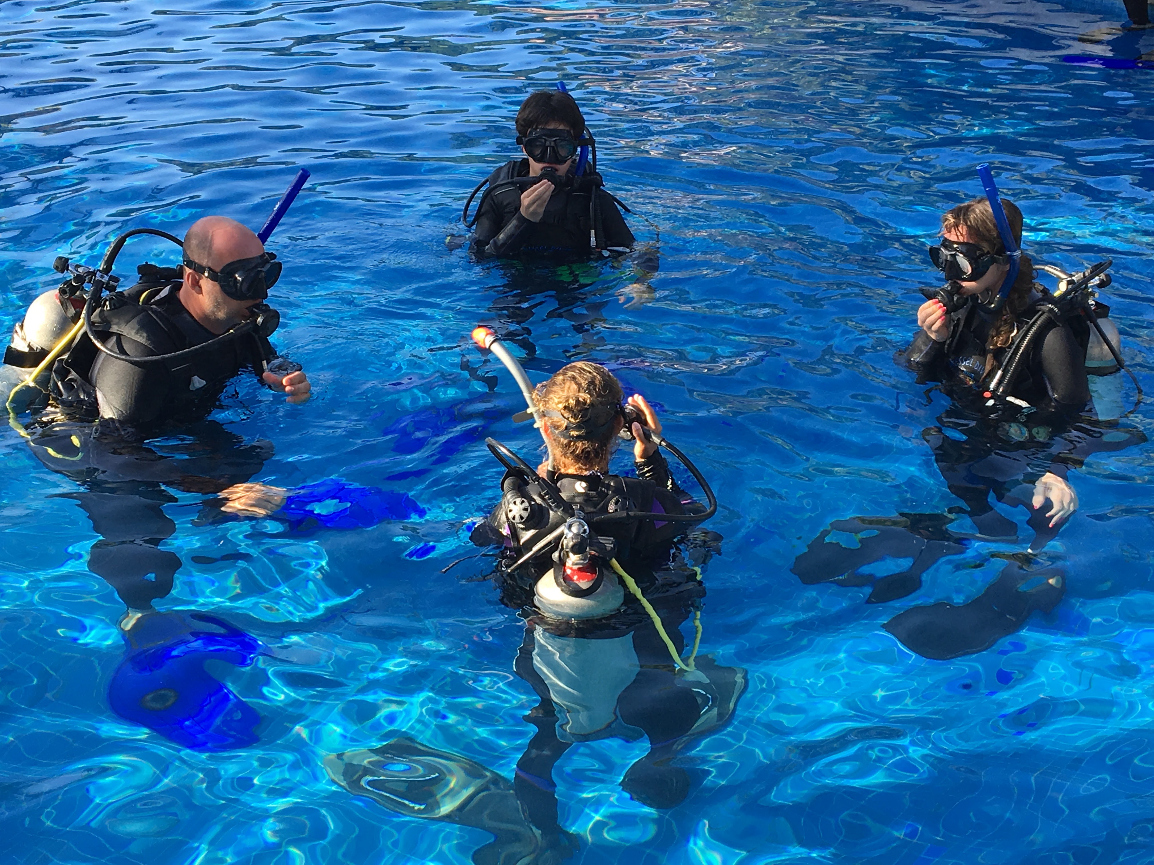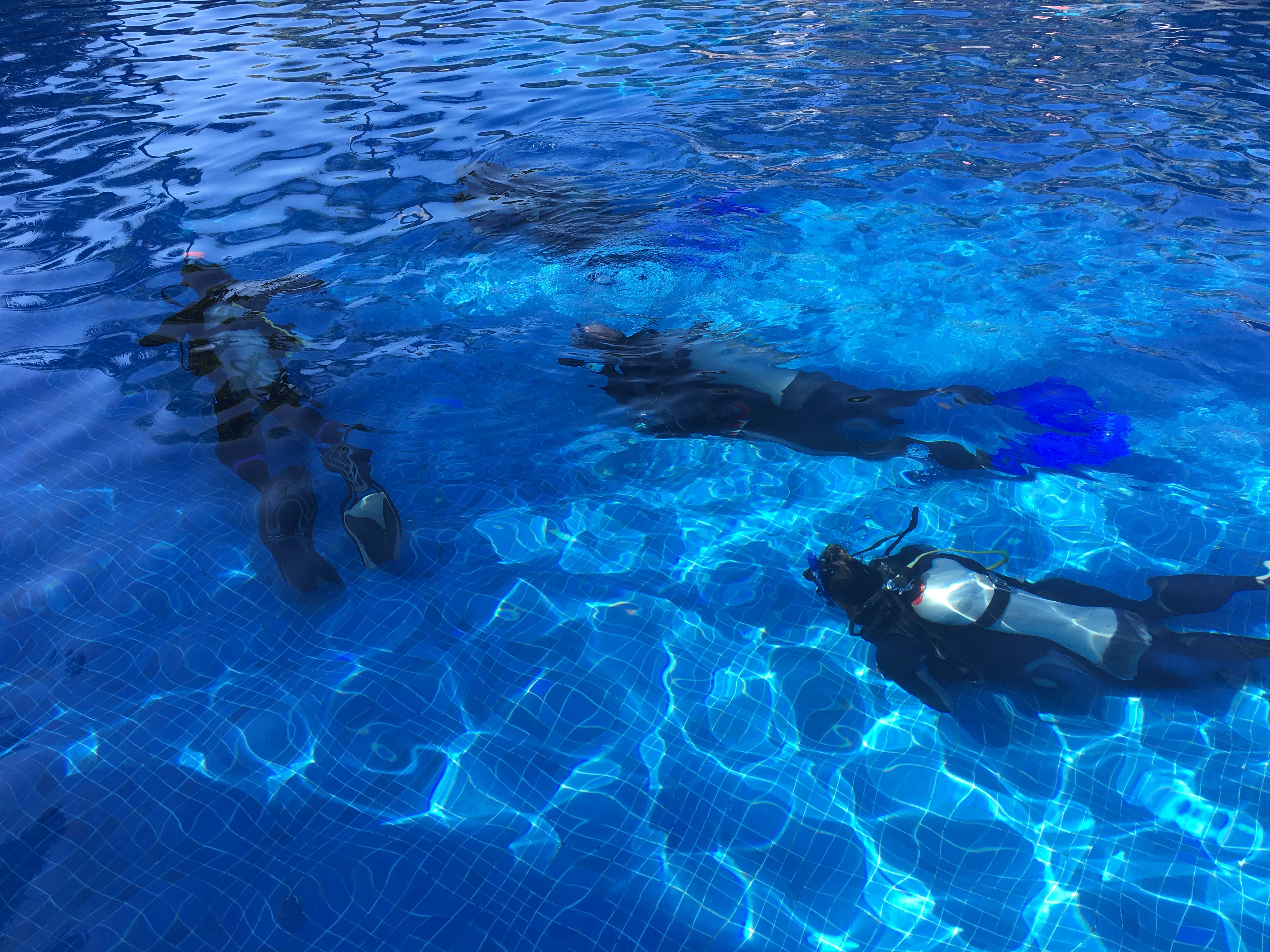 Notre instructrice nous emmène dans la piscine où elle nous explique les bases de la plongée. Nous sommes totalement novices donc tout est une découverte pour nous: les signes pour communiquer, l’impact du remplissage de ses poumons, équilibrer la pression dans les oreilles, se stabiliser, etc.