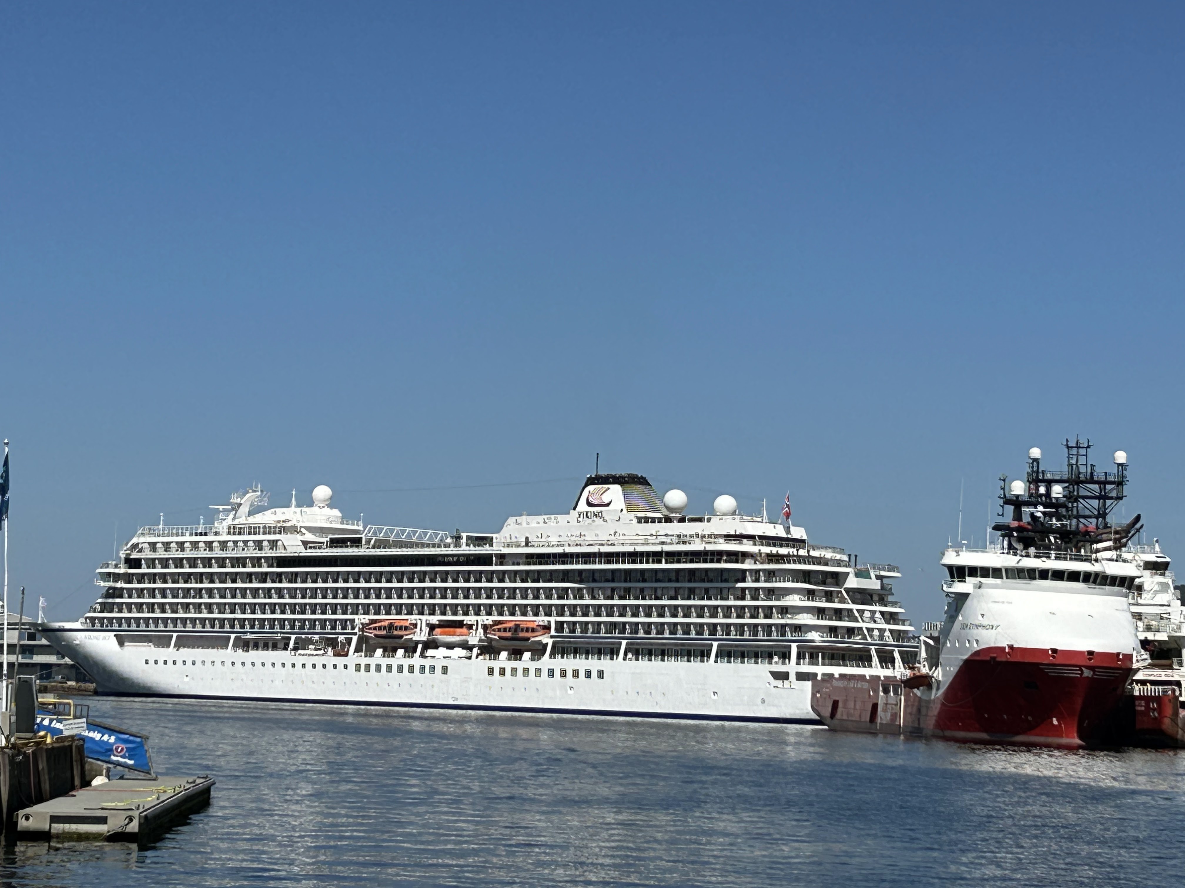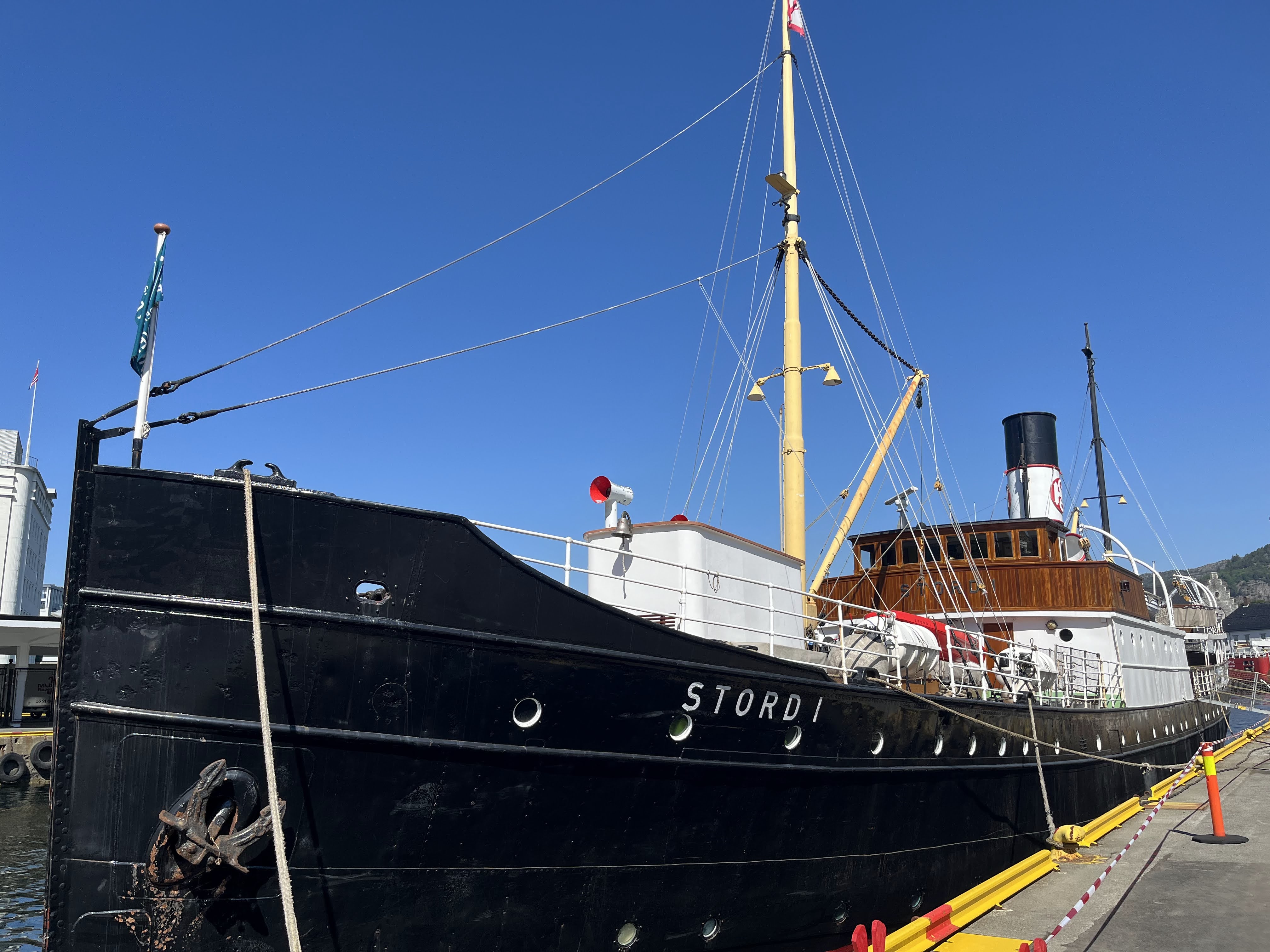 De ce côté, le port est tout d’abord industriel. On ne peut d’ailleurs pas longer la berge et nous devons retourner sur la route. Lorsque nous pouvons rejoindre la jetée, nous tombons sur un ancien cargo qui propose des croisières. En face, se trouve la jetée dans le prolongement de Bryggen où un bateau de croisière a pris place à côté des imposants remorqueurs que nous avions vus le premier jour.