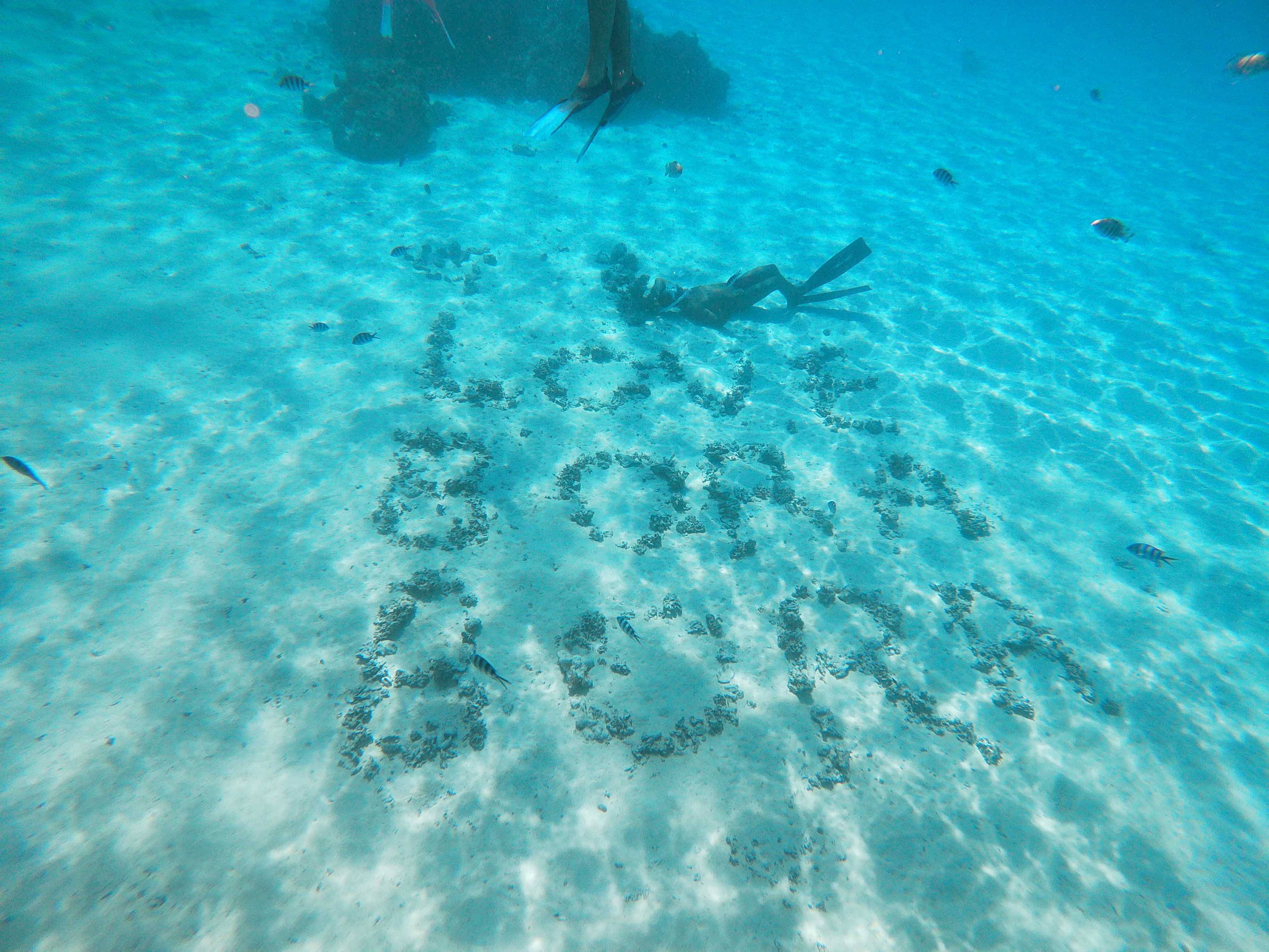 En nageant vers le bateau, nous passons au-dessus d’une étendue sablonneuse où « I LOVE BORA BORA » est écrit à l’aide de coquillages. Ca fait son effet🙂