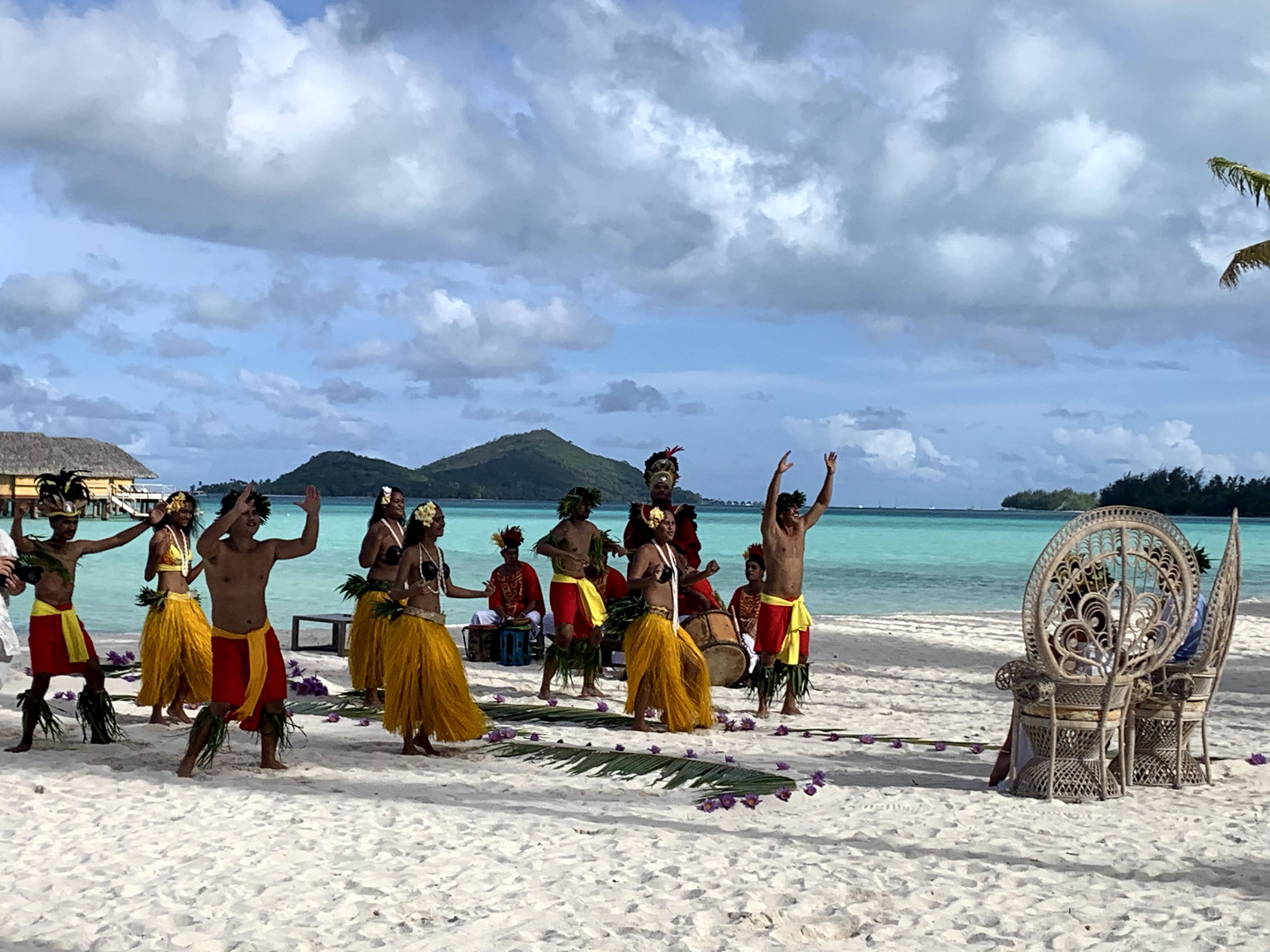 La plage est magnifique et une cérémonie de mariage polynésien s’y déroule. C’est une des prestations que l’hôtel a à son catalogue. Les mariés ont de splendides couronnes et colliers de fleurs (nous sommes jaloux) et son accompagnés de chants et danses.