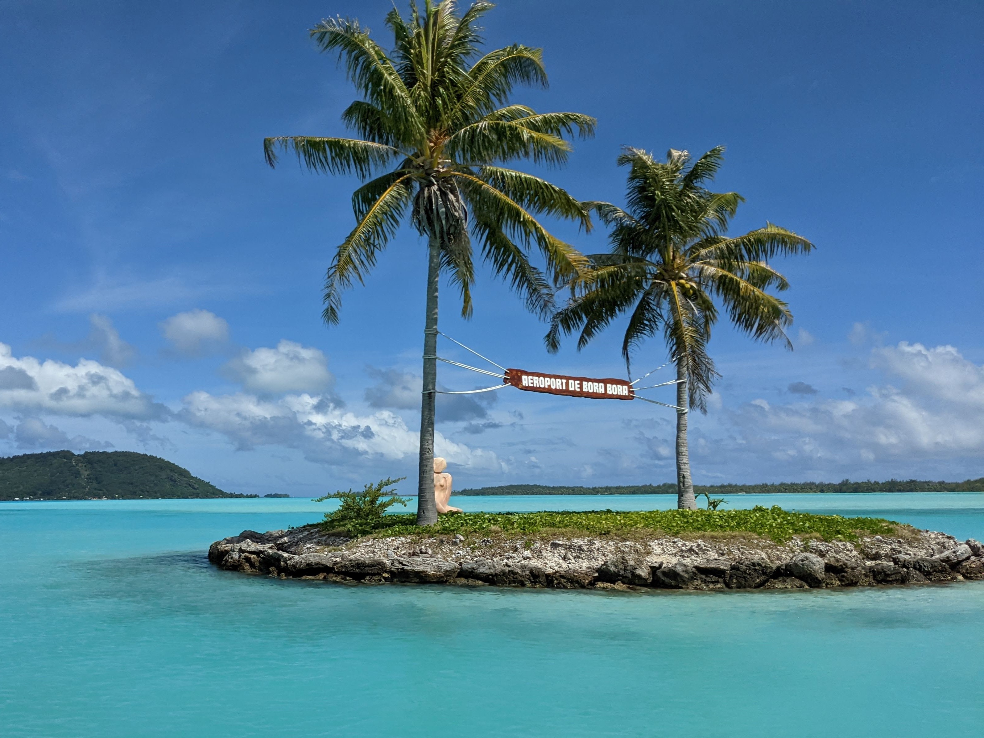 Dans l’avion, on nous a conseillé de nous installer à gauche pour avoir la vue sur l’ile en approchant. En effet, le spectacle vaut le coup ! L’avion dépasse l’ile puis fait demi-tour pour se poser sur le motu-aéroport. Il ne doit pas y avoir beaucoup d’aéroports qui offrent une telle vue.