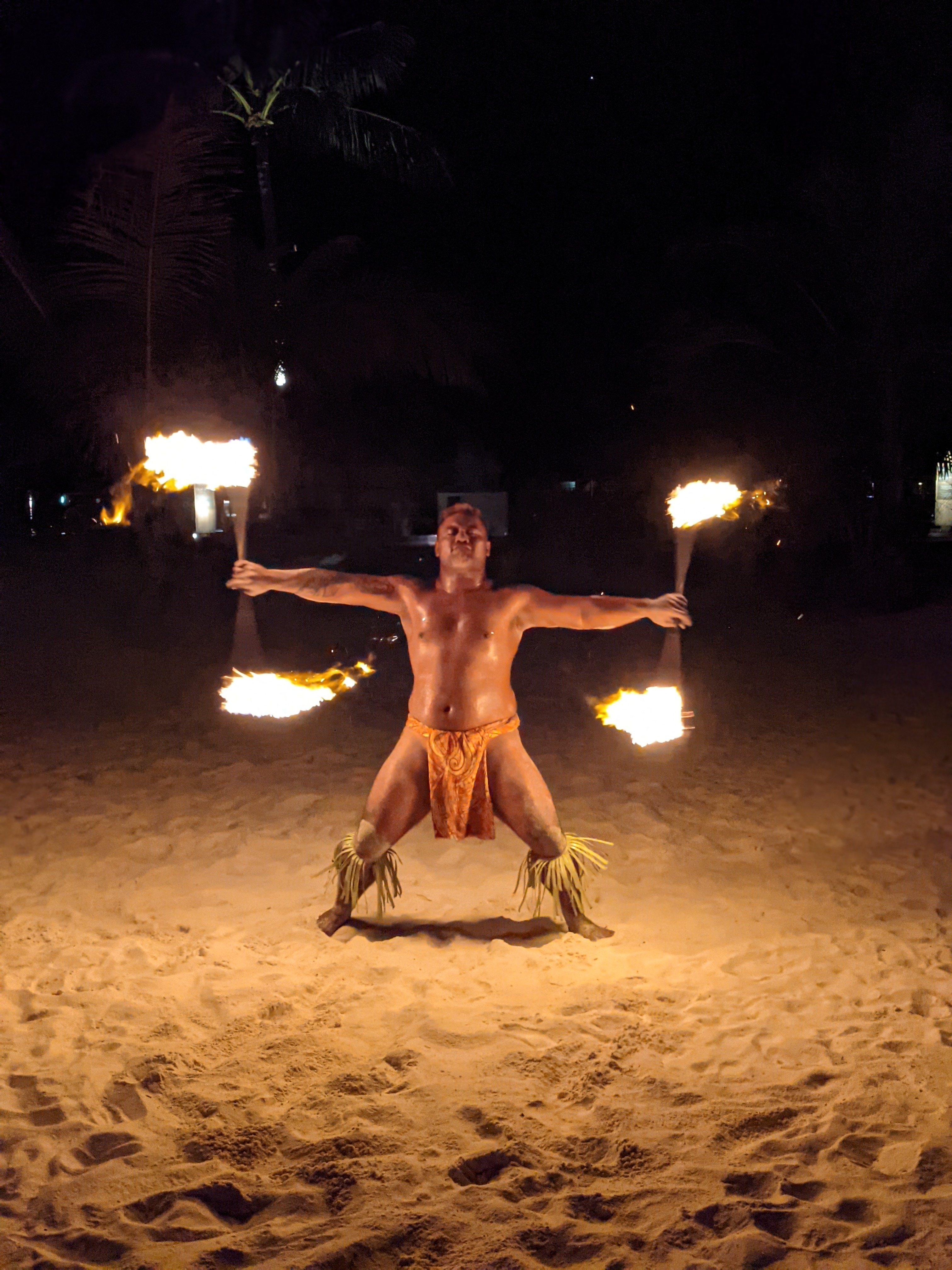 Puis nous finissons la journée avec un impressionnant spectacle de danseurs de feu sur la plage.