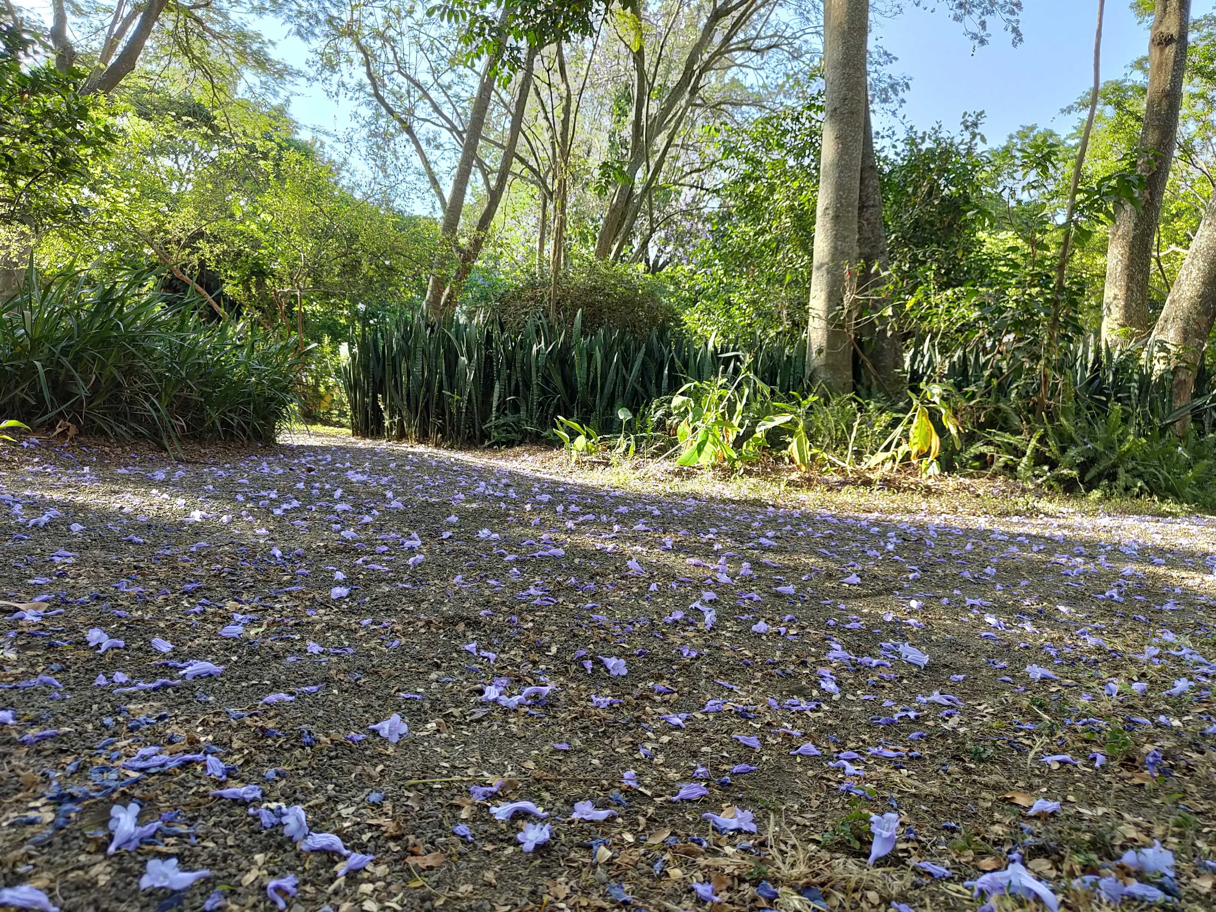 Dans les arbres, des singes sautent de branches en branches, nous espérons qu’ils ne vont pas continuer cette nuit ! Les pétales mauves des fleurs jonchent le sol, c’est magnifique.
